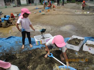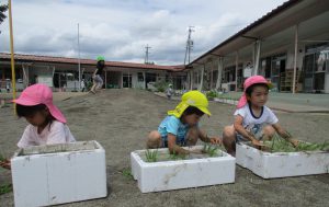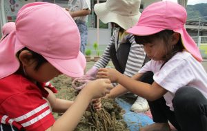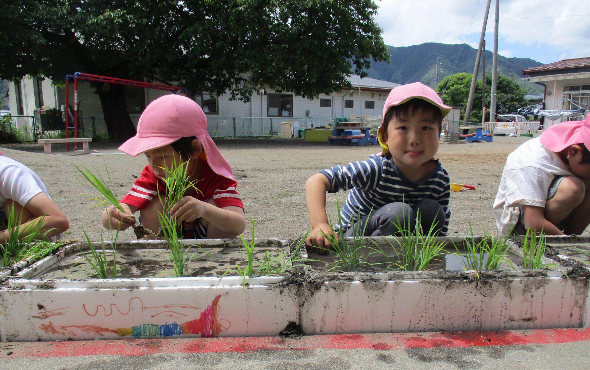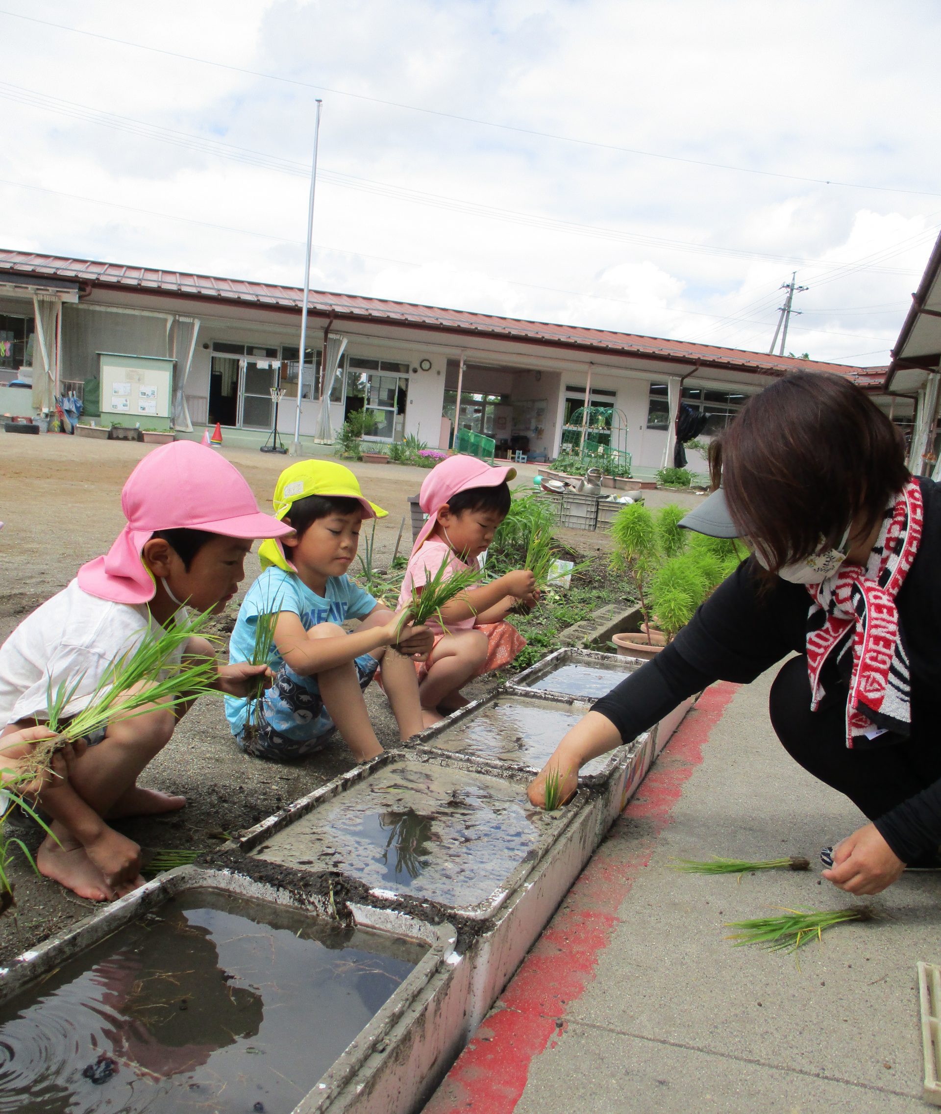 昨年度年長さんが米を育てていた姿を見ていて、自分たちが年長組になった今年「お米を育てて焼きおにぎりを作りたい!」といった子ども達。小さな田んぼを作るまでの大変なことも「やりたい!」の気持ちがあったから、頑張る年長児でした。そんな子ども達の”やりたい!”を実現できるよう、少しの手助けと一緒に取り組める保育の仕事にやりがいを感じています。きっと、稲のお世話をし成長を喜び、最後にはおいしい焼きおにぎりが子ども達のお腹も心も満たしてくれることでしょう。そうなれるようにこれからも稲の生長ともに子ども達の成長を見守っていきたいと思います。
