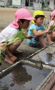 今年も田植えの時期がやってきました。保育園周辺の田んぼも田植えが終わり、毎日のように散歩に出かける子ども達はその様子を見て「保育園の田植えはいつする?」と。保育園でも稲づくりが始まりました。