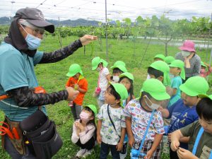 毎年、年長児さんに声をかけていただいて、花の袋掛けや収穫を体験させていただいています。