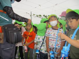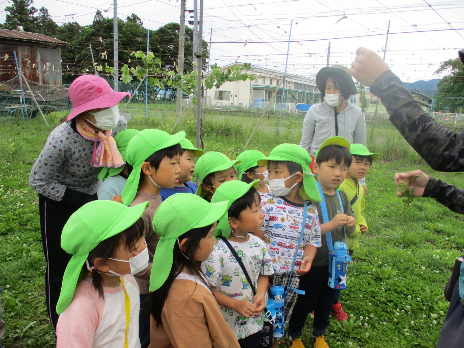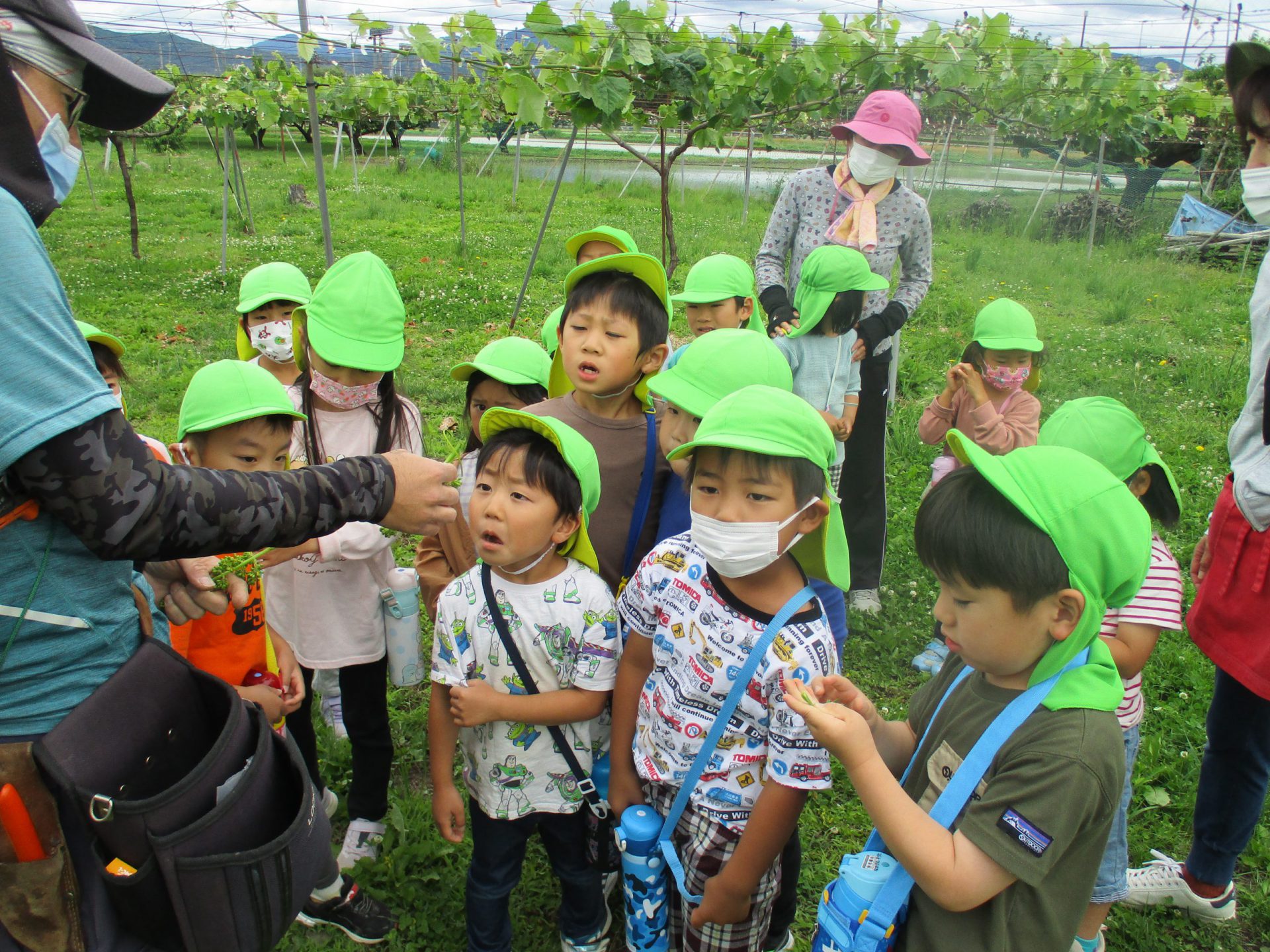 今年の年長児20名も、さっそく「ぶどうの花は、なんな色?」と興味を持ち、あぜ道を通って行ってみました。