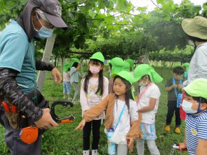 Kさん:「ぶどうの花は、こんなにたくさん咲くんだけど、上のほうは摘んでしまうんだよ。なぜかというと、全部育ててしまうと、大きな粒にならないんだよ」