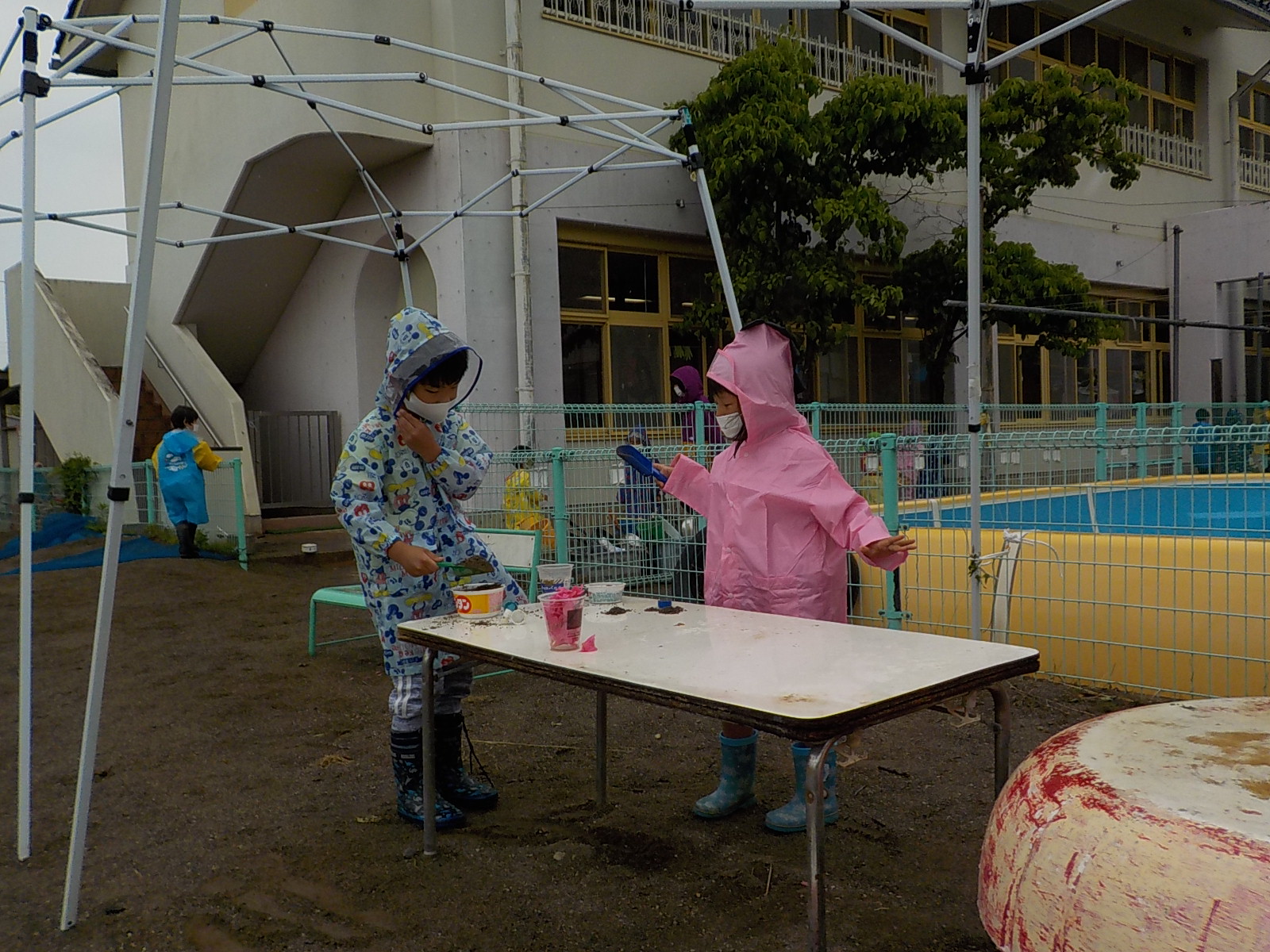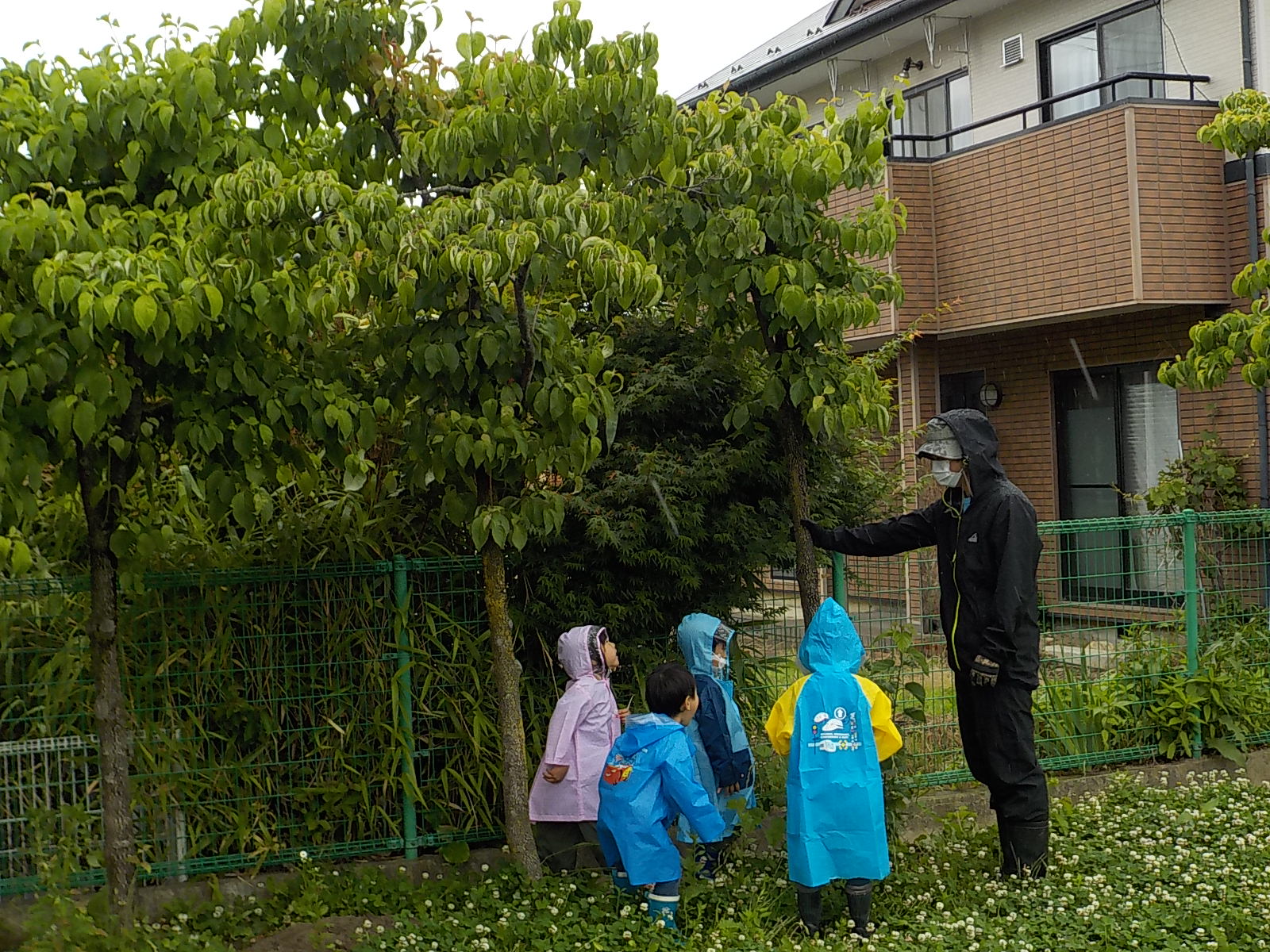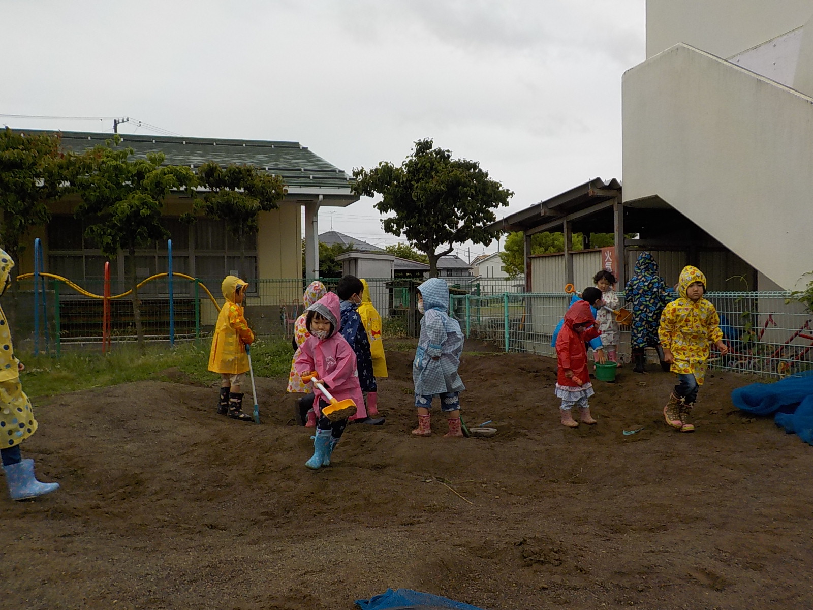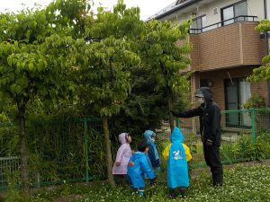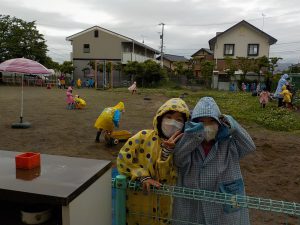 朝から小雨が降っていましたが、子ども達は合羽を着て園庭に出ました。