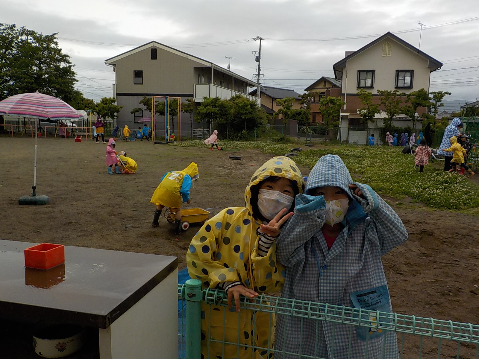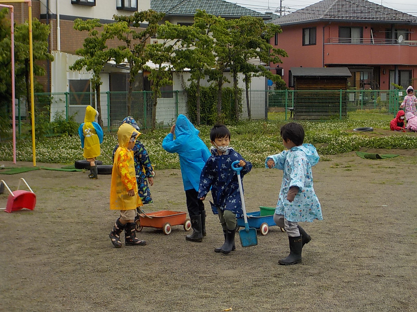 いつもの園庭も晴れの日と雨の日では様子が異なり、その違いを子ども達は感じながら元気に走り回っていました。何よりも合羽を着れたことが嬉しそうな子ども達でした。