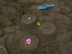 ケーキを作っていた子に「今日はどんな感じ?」と聞いてみたところ「雨で砂が濡れているから作りやすいよ」という言葉が返ってきました。