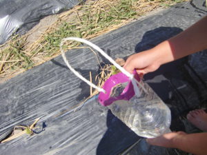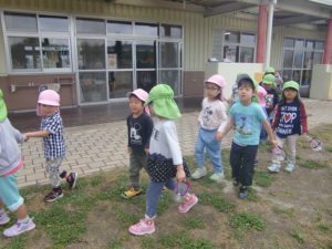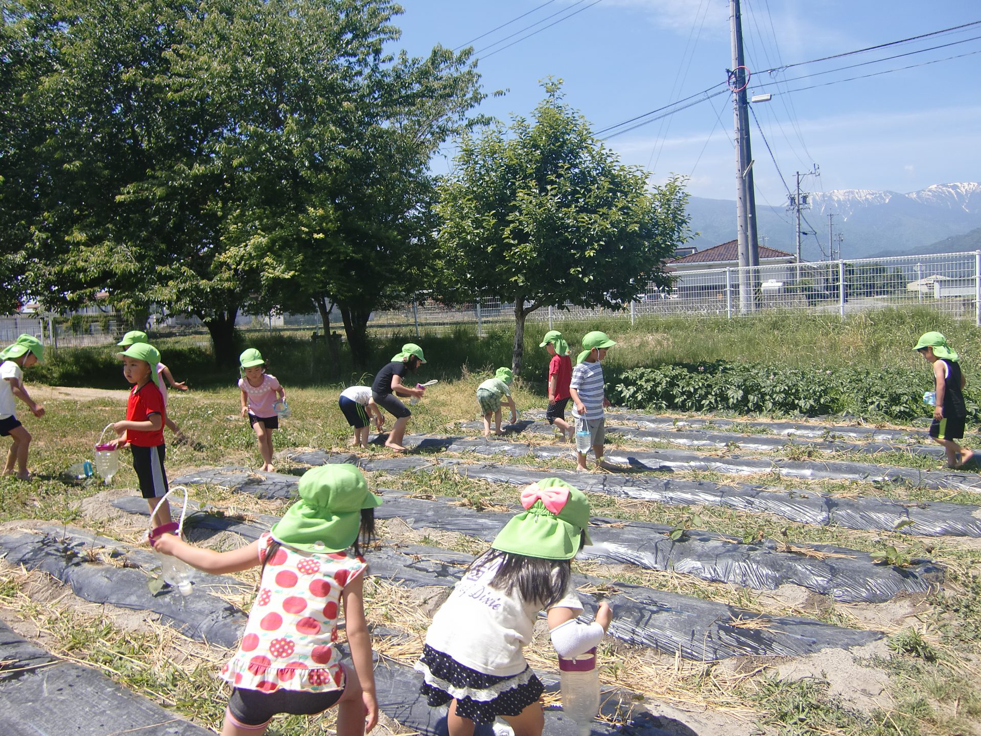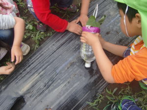 年長児を中心に年中児、年少児3人組で苗を植えました。ペットボトルのバケツを持って、小さいお友達をリードして畑に向かいます。