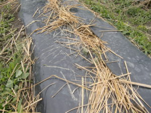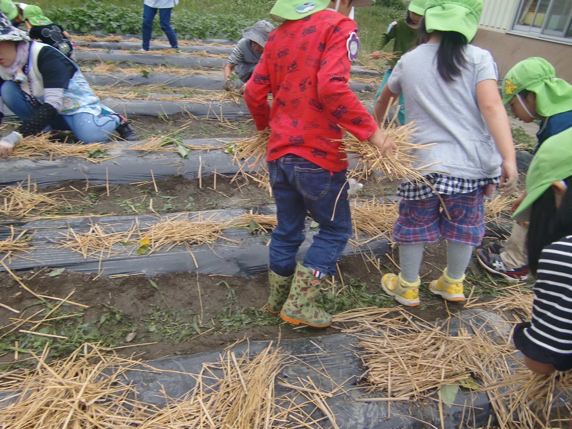 「大きくなりますように。」みんなでお願いしました。その後、藁をかけて日除けを作るのは年長さんの仕事。