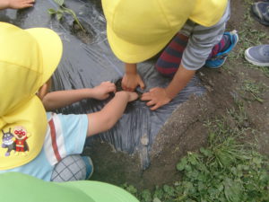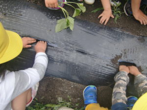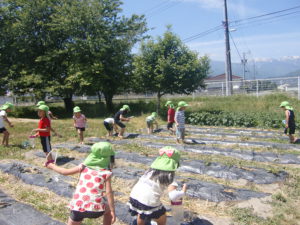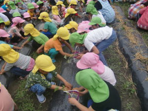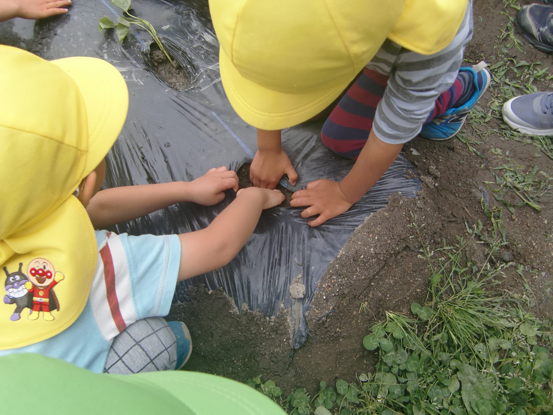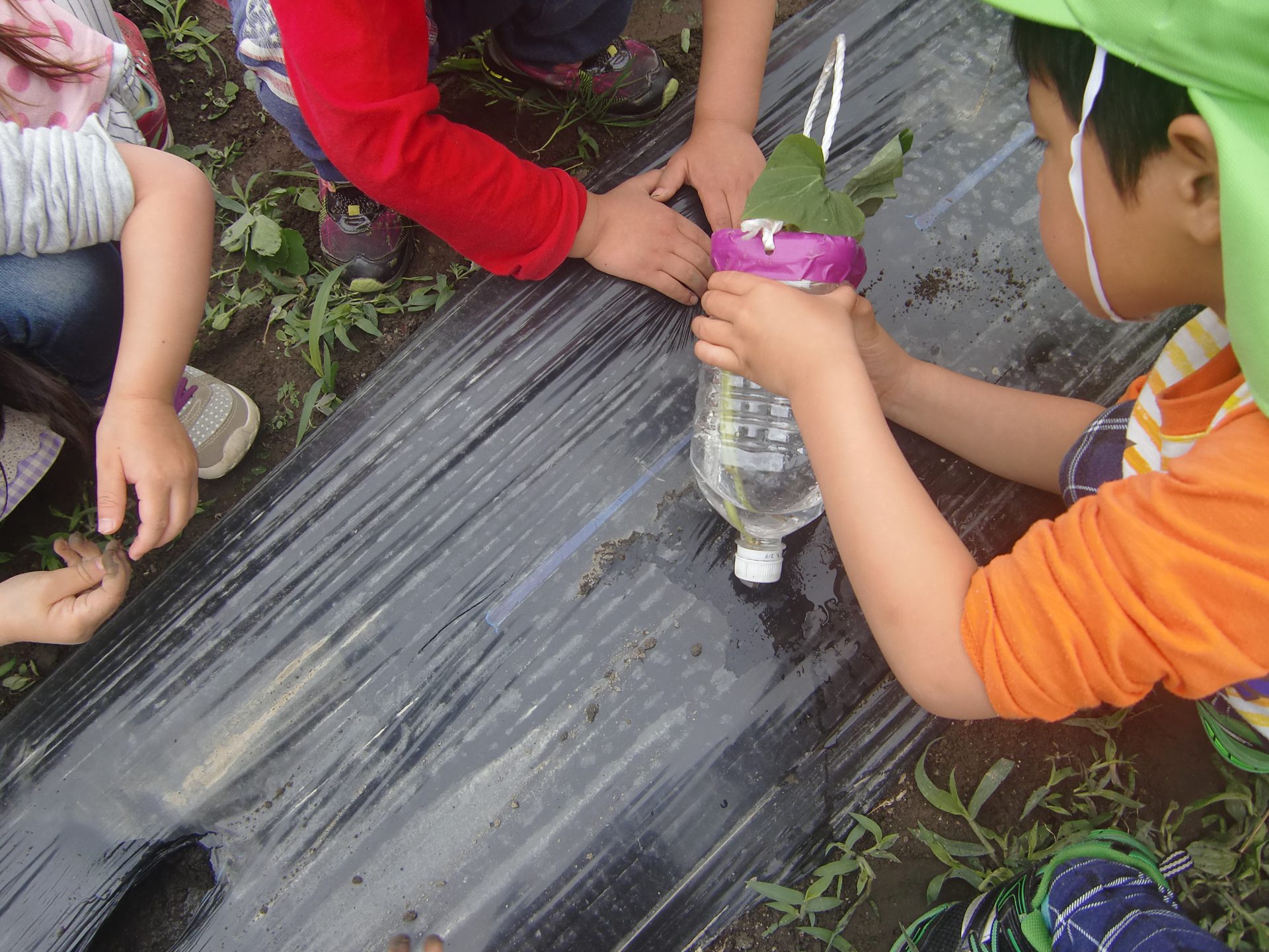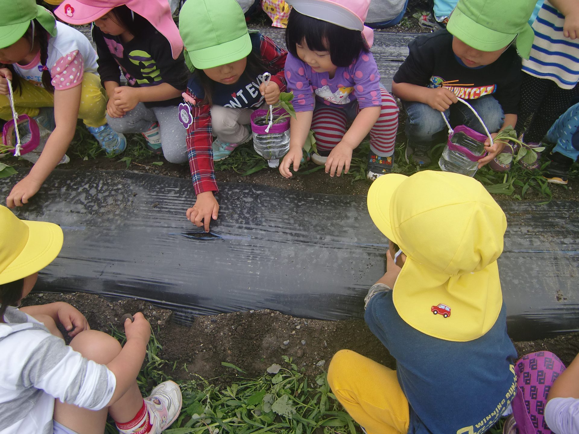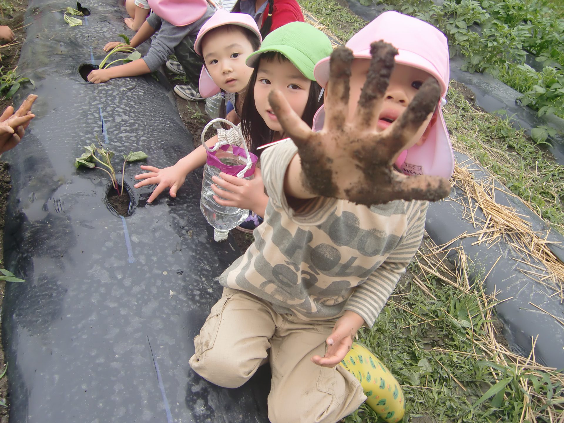 先行して、年長児だけで保育者に教わりながら苗を植えました。
