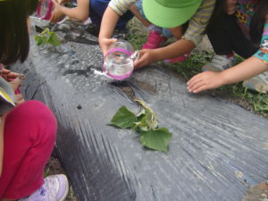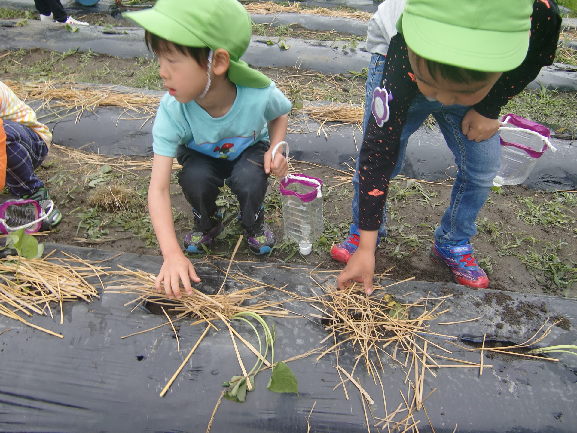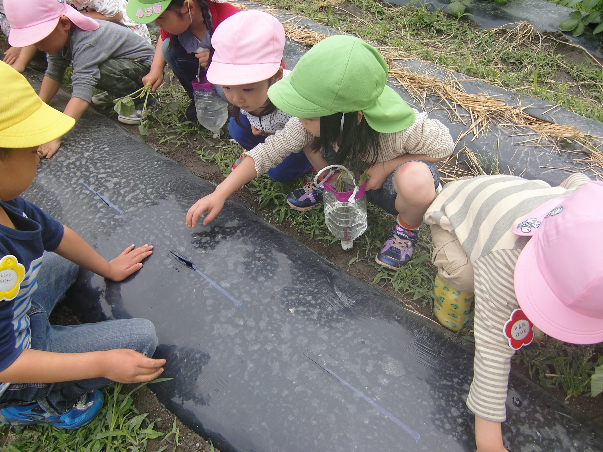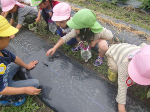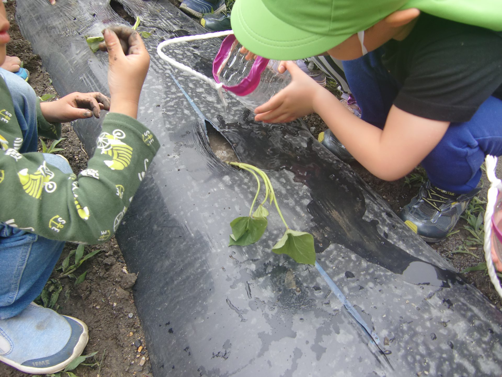 苗が枯れないように、毎日水くれをするこども達。「外で遊ぶよ。」と言う保育者に、「さつまいもにお水をあげに行こう!」と言うこども達からの声がありました。