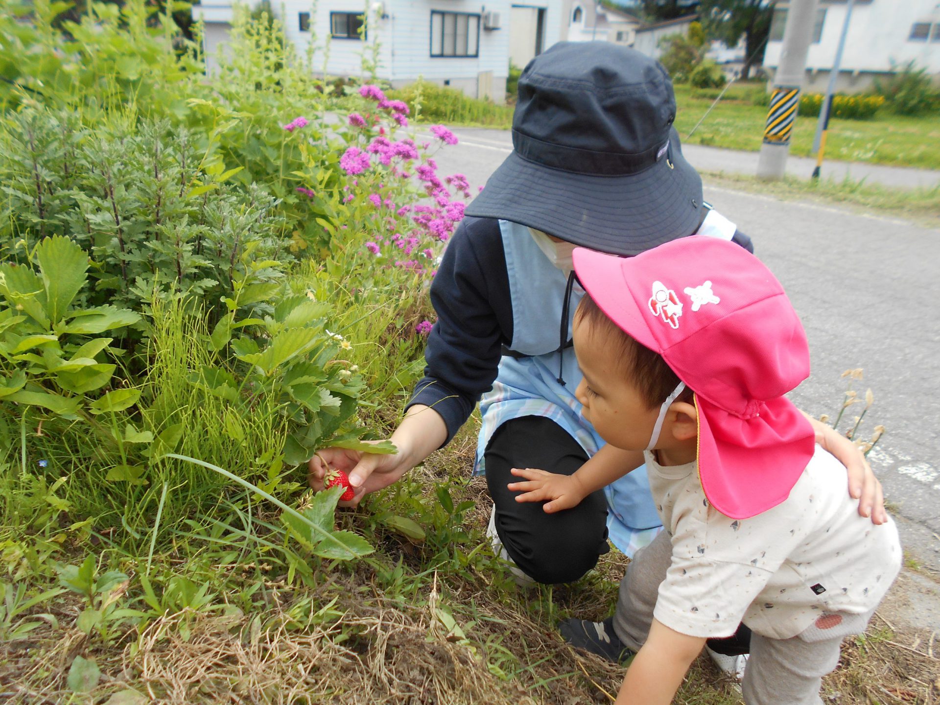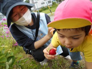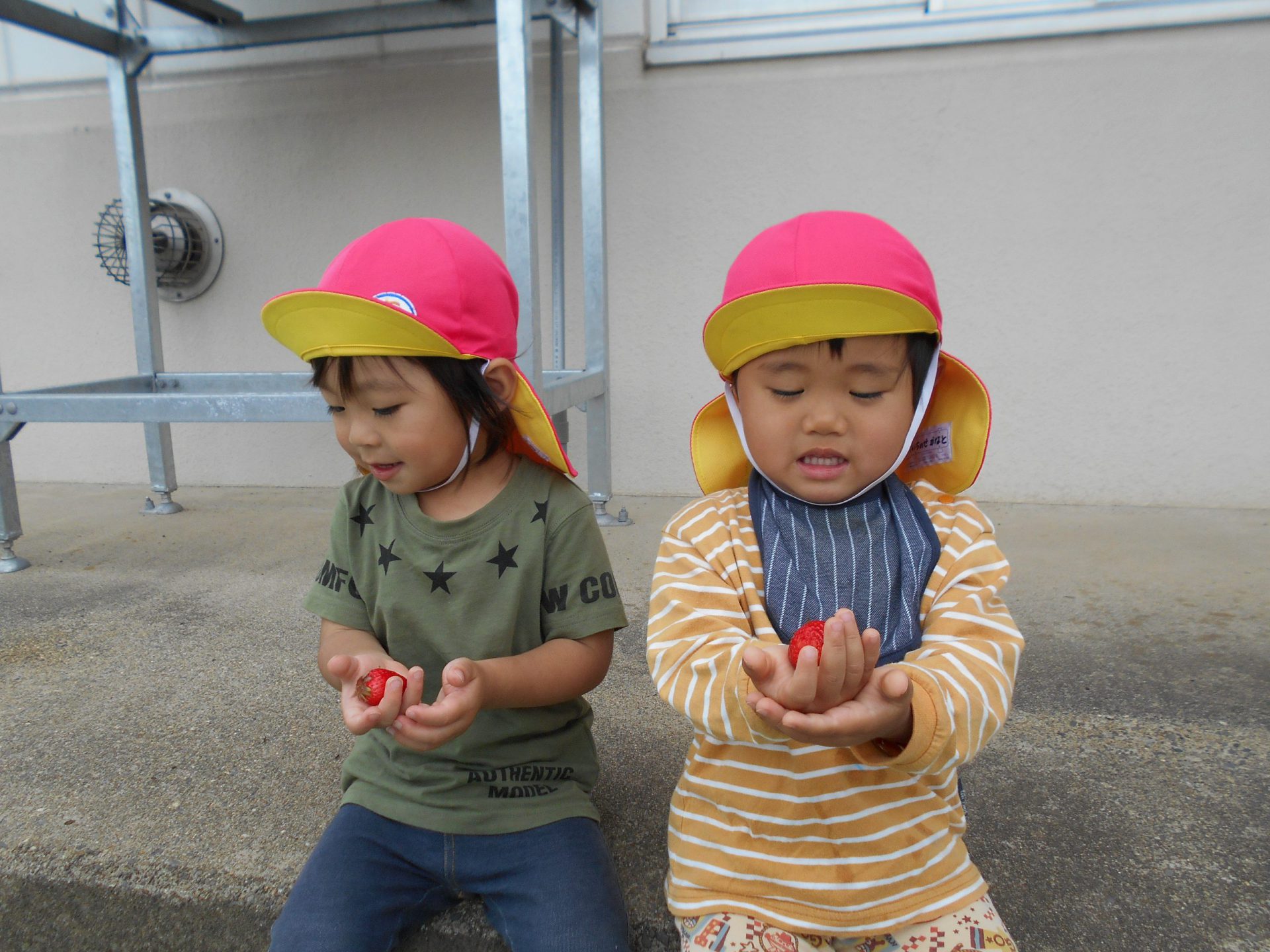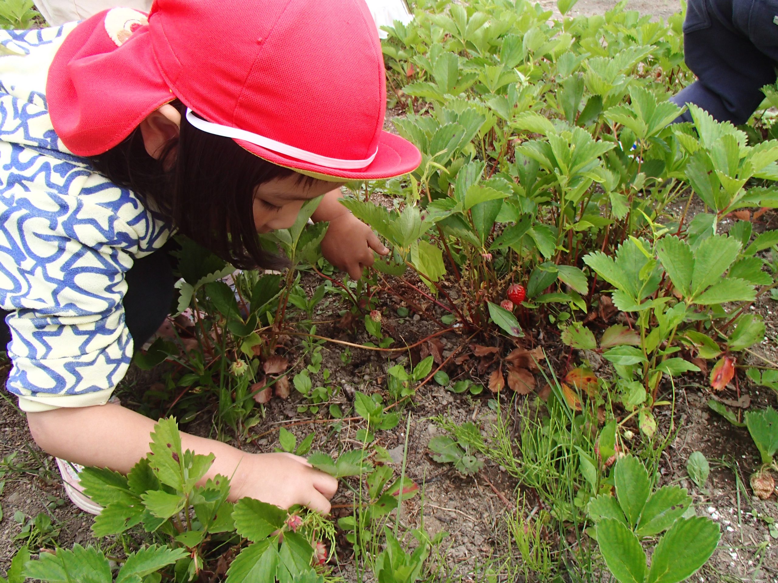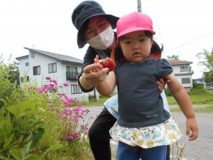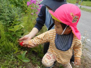 今まで、散歩で畑を見てもスルーしていた子どもたちですが、園庭の花壇を指差し「いちご?」と畑や花にも興味が出てきたようです。