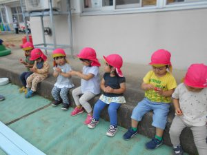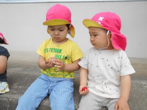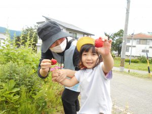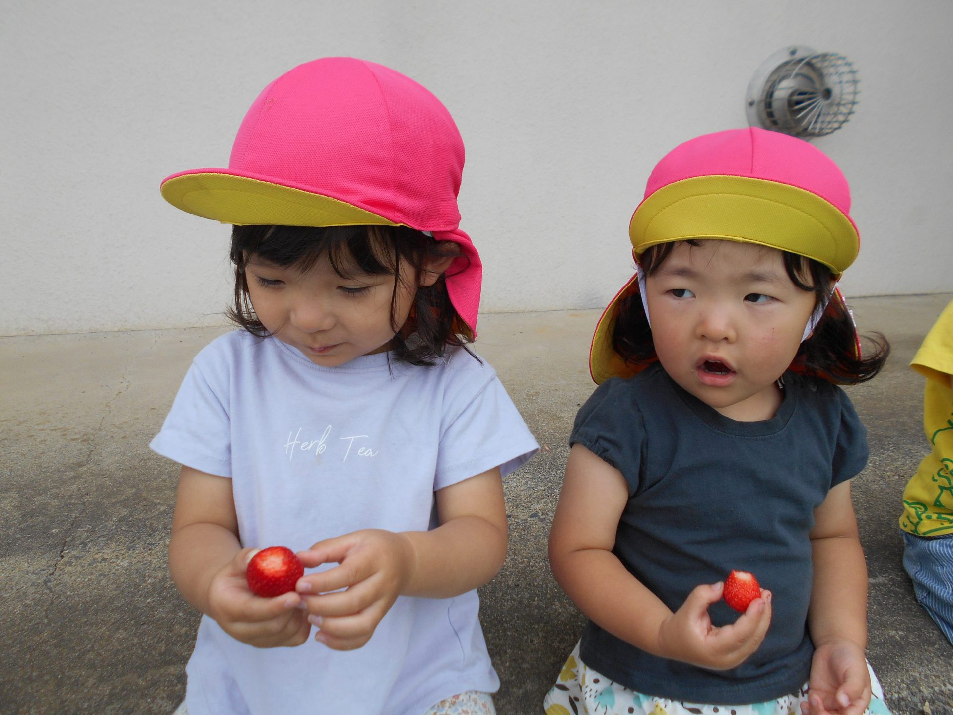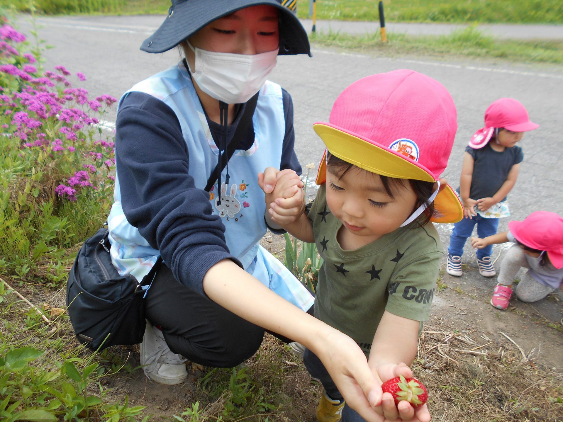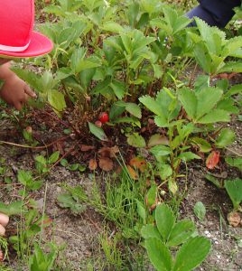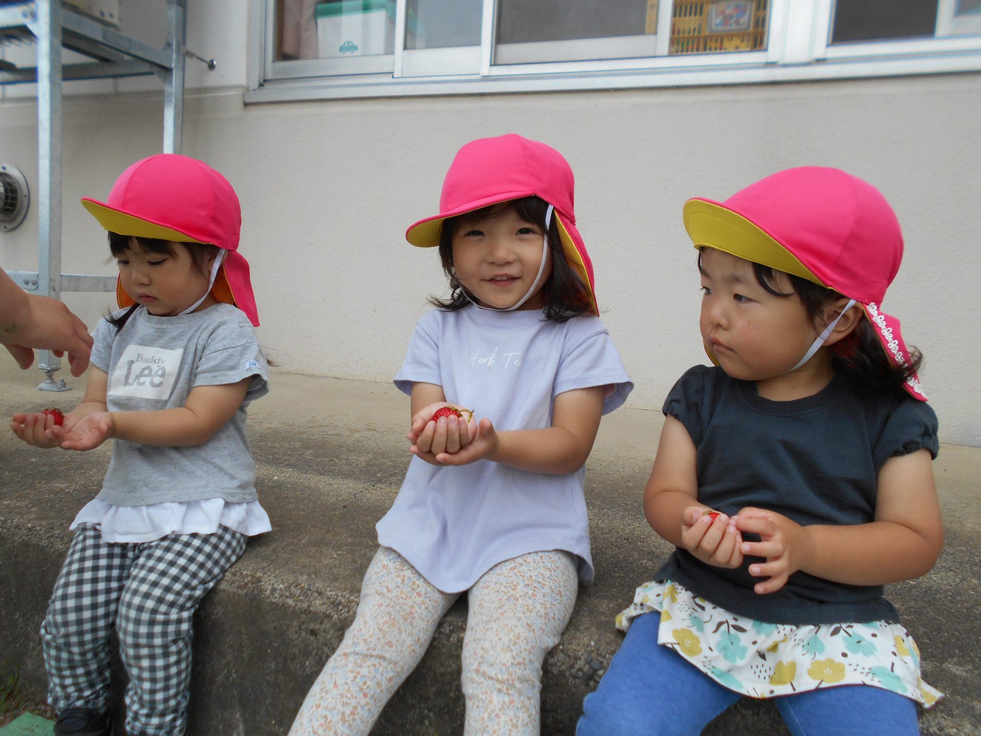 今まで、散歩で畑を見てもスルーしていた子どもたちですが、園庭の花壇を指差し「いちご?」と畑や花にも興味が出てきたようです。