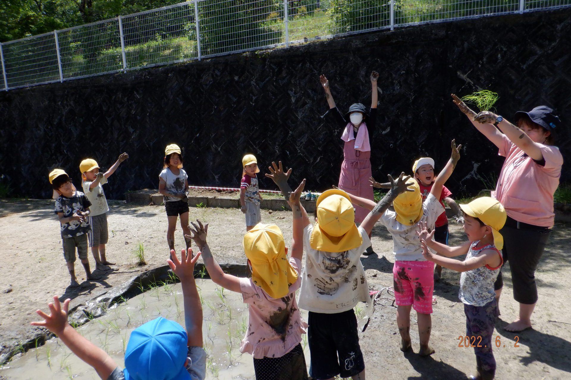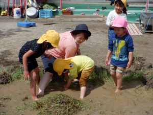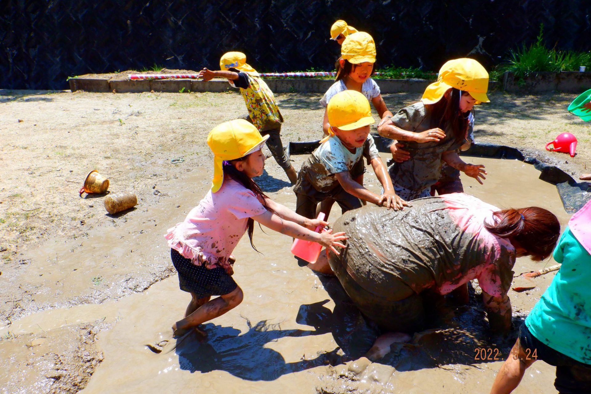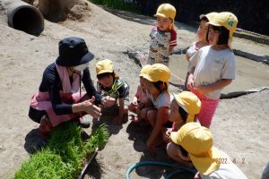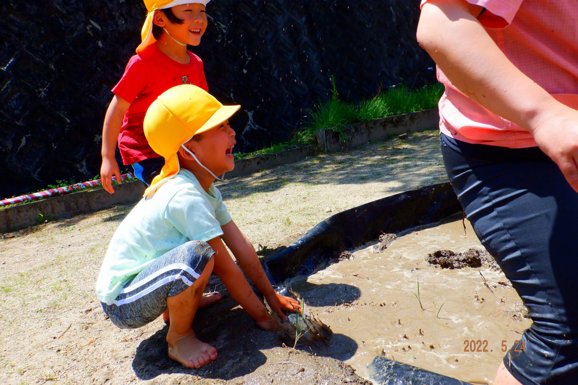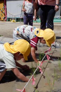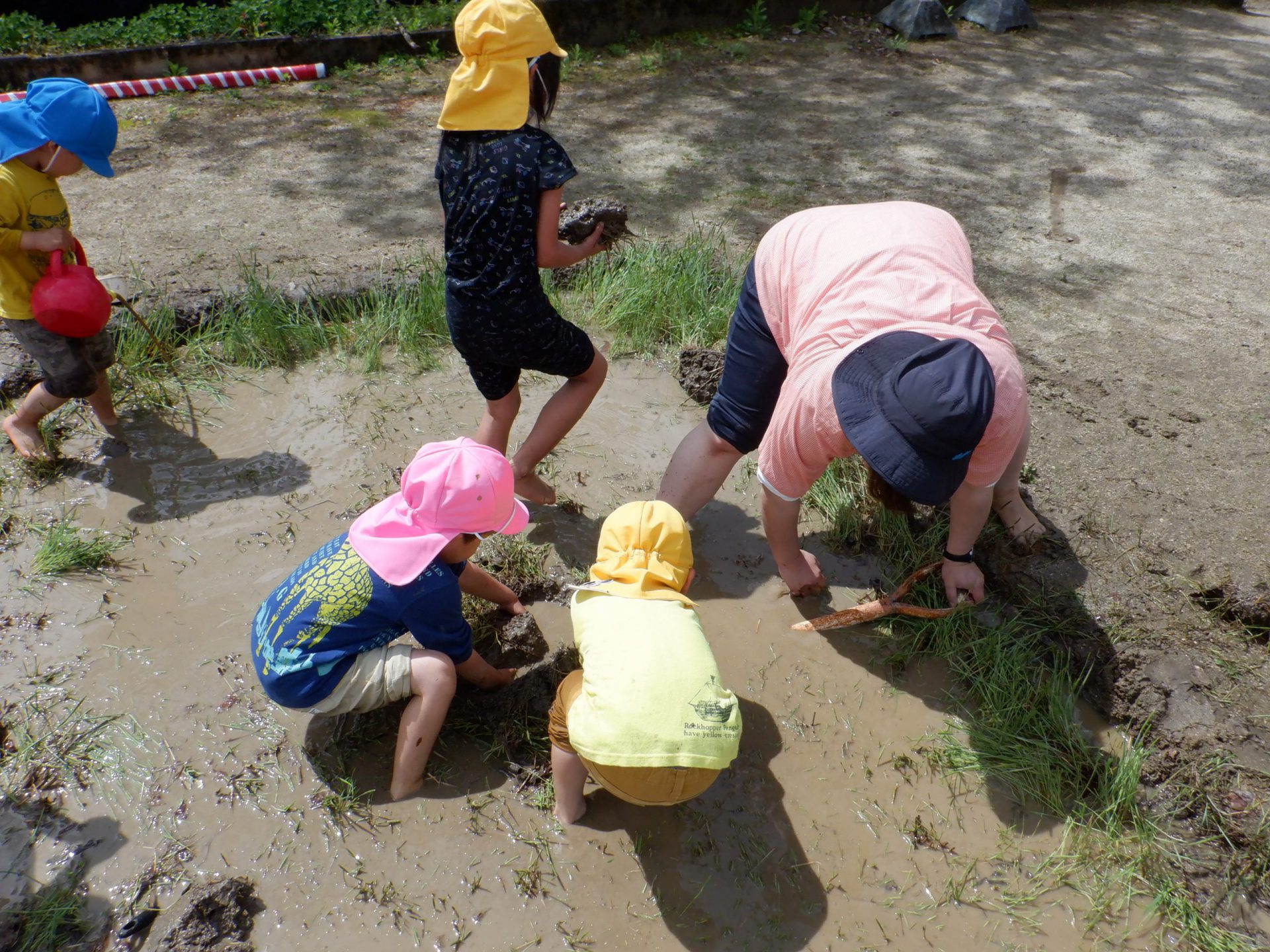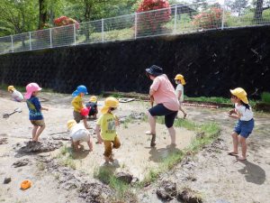 保育園の園庭に作られている田んぼで、例年行う米作り。年長児が地域の田んぼに出かける行事としての田植えとはまた違い、全園児が遊びとして関わっていることで、昨年の様子を覚えていたり、一から田んぼを作り、たくさん泥んこに触れて親しんだからこそ、「次は田植えだ!」と気持ちが向いていったように思う。
