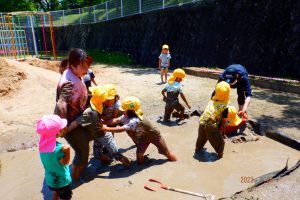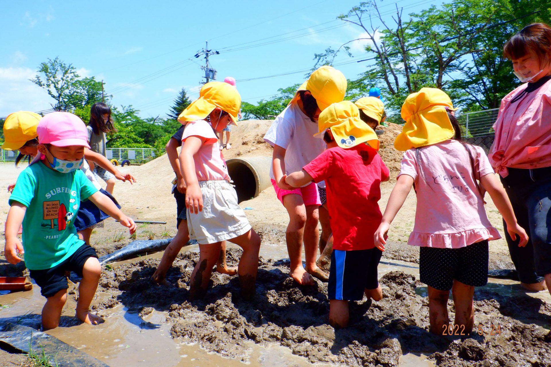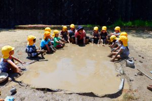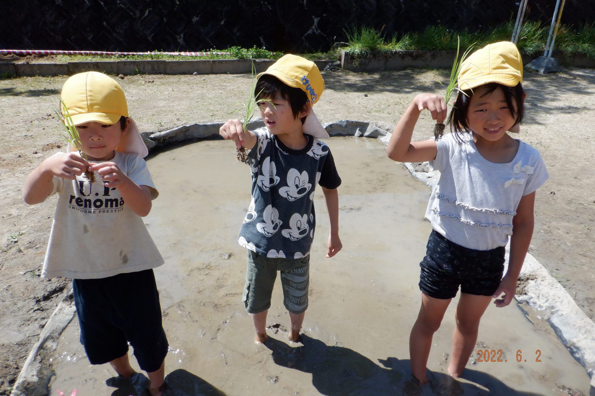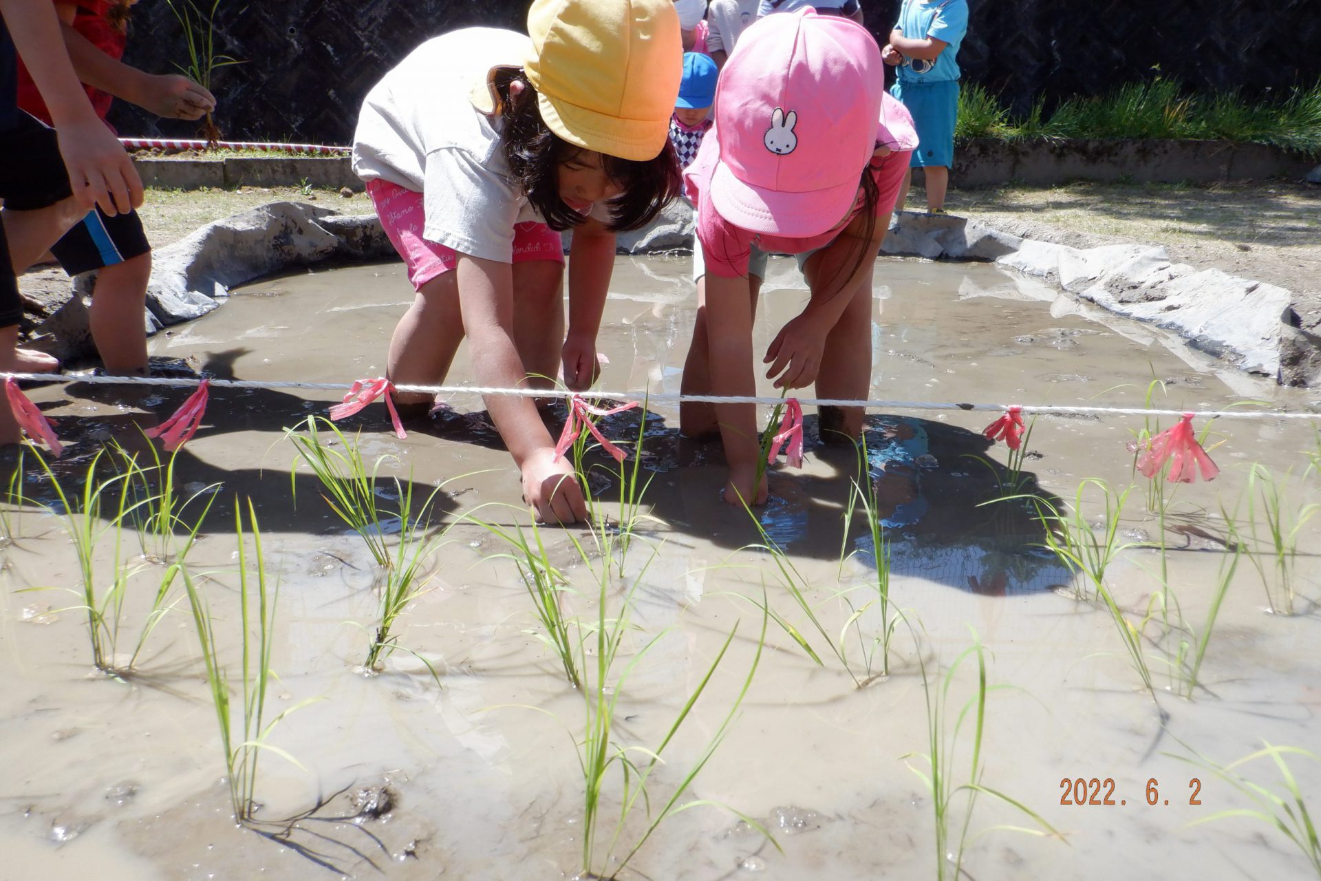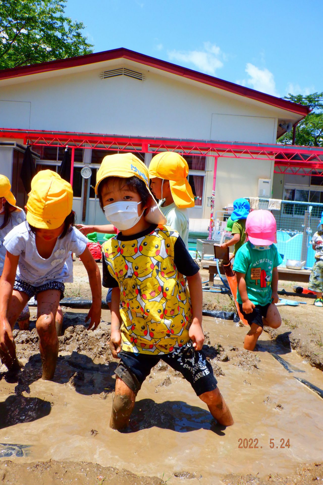 保育園の園庭に作られている田んぼで、例年行う米作り。年長児が地域の田んぼに出かける行事としての田植えとはまた違い、全園児が遊びとして関わっていることで、昨年の様子を覚えていたり、一から田んぼを作り、たくさん泥んこに触れて親しんだからこそ、「次は田植えだ!」と気持ちが向いていったように思う。