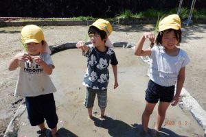 ・田んぼに水が加わるにつれて、様子や感触が違うことに気付いていった子ども達、遊びながら徐々に田んぼらしい田んぼになっていった。