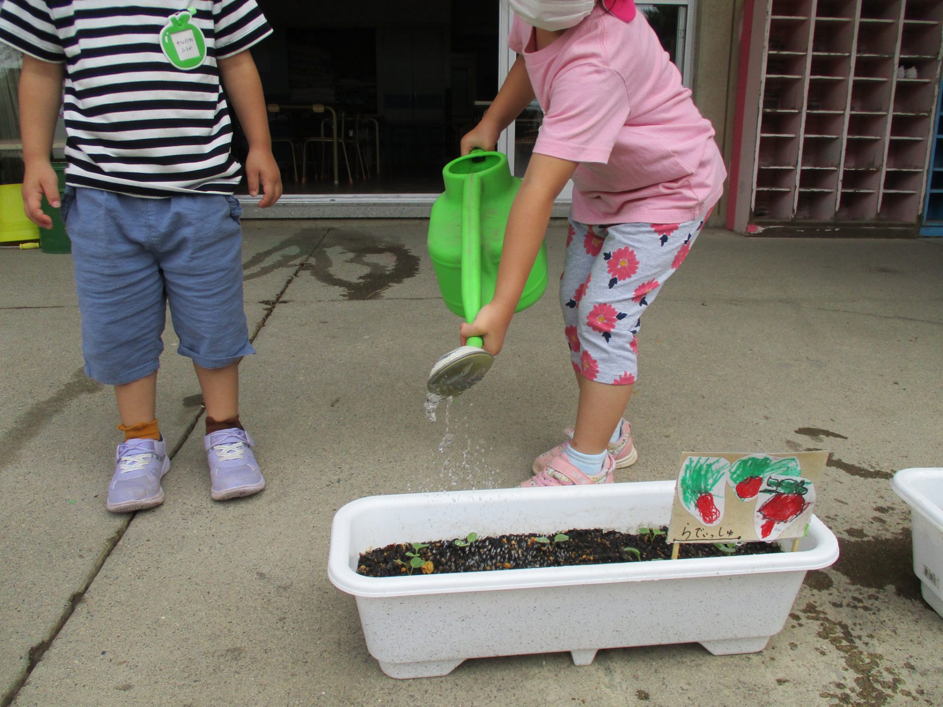 クラスの前で育てているラディッシュに水やりをする年中さん。