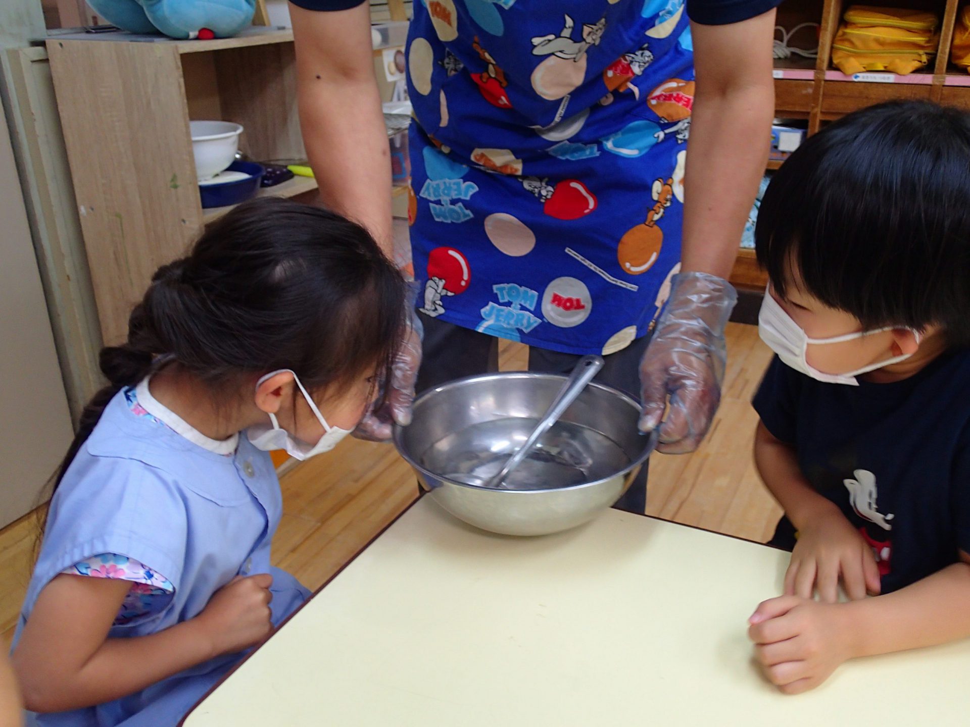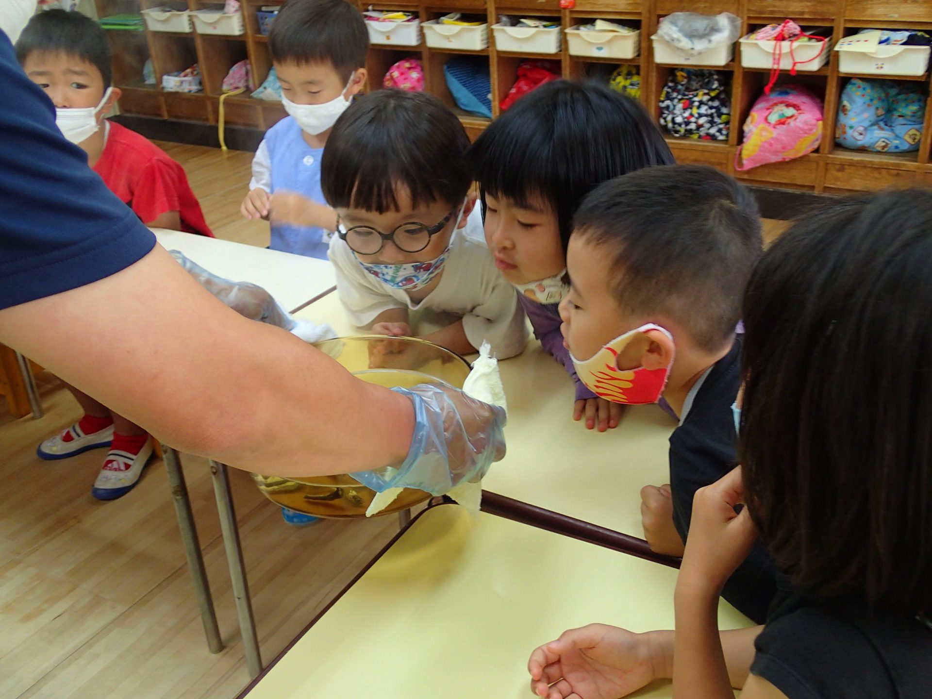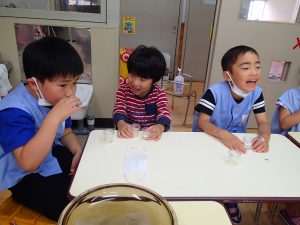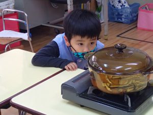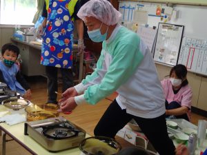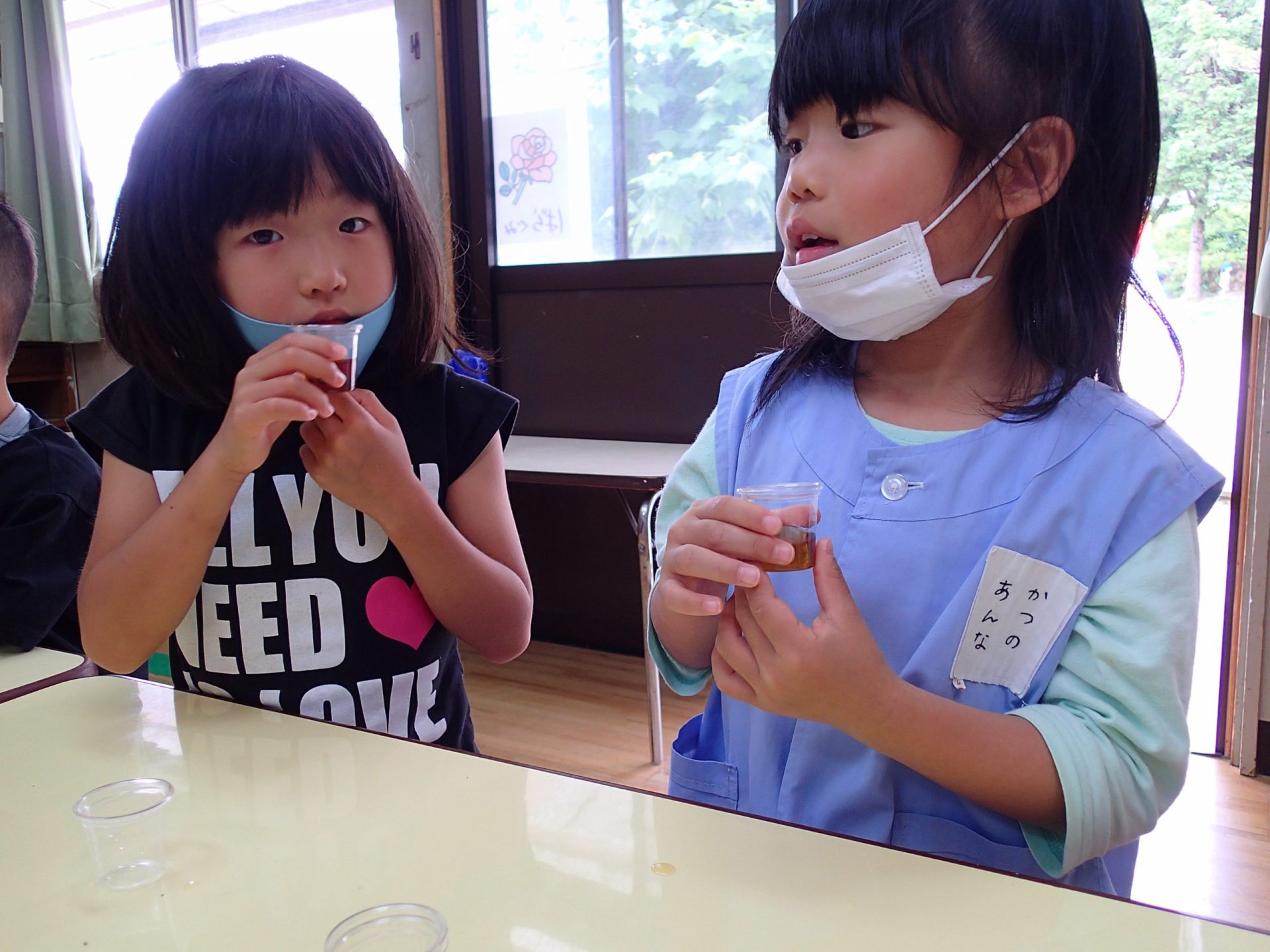 ・給食のとき、スープの匂いを嗅ぎながら「なんのダシだ?」という声も聞かれます。これを機会に食に関心を持つと共に、いろいろなことに興味関心を持って、自分たちで調べたり、試したりする力が育っていけたらと思っています。