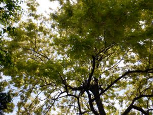 アカシアの木の下に寝転がって見える景色や花びらシャワーに大喜び!