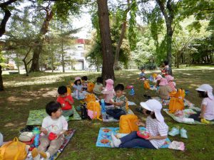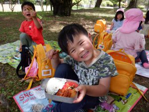みんなで食べるご飯はおいしいね!外で食べると気持ちいいね!