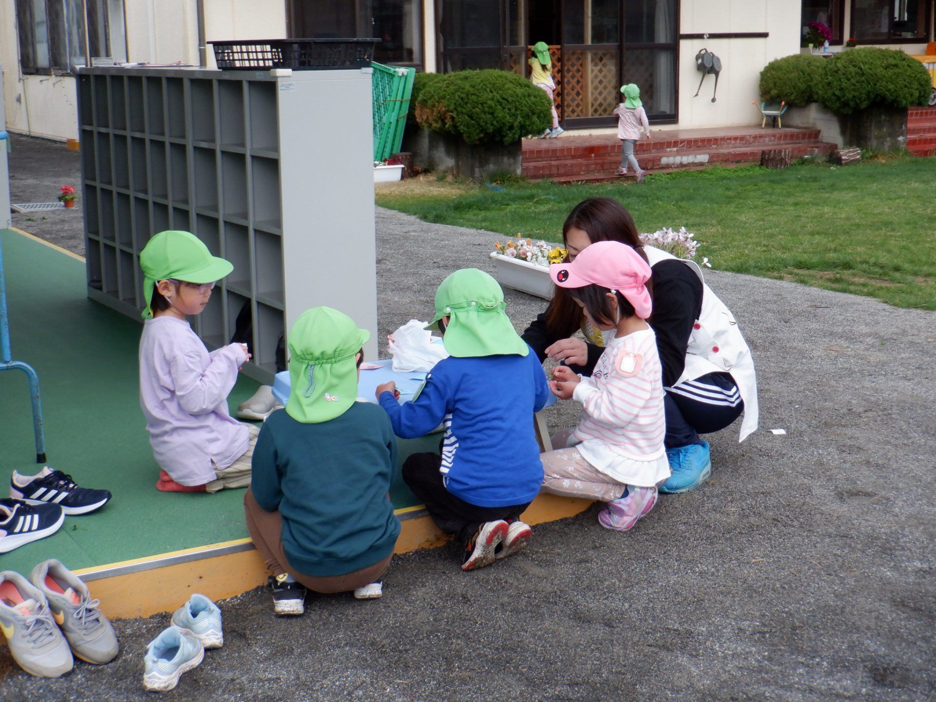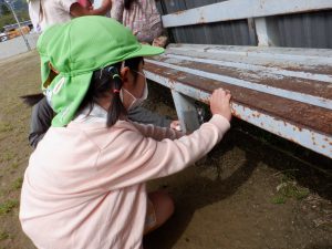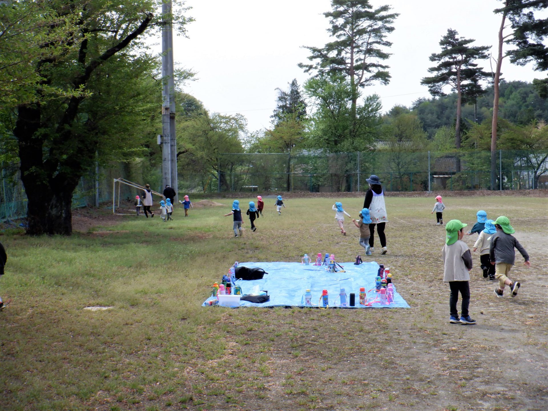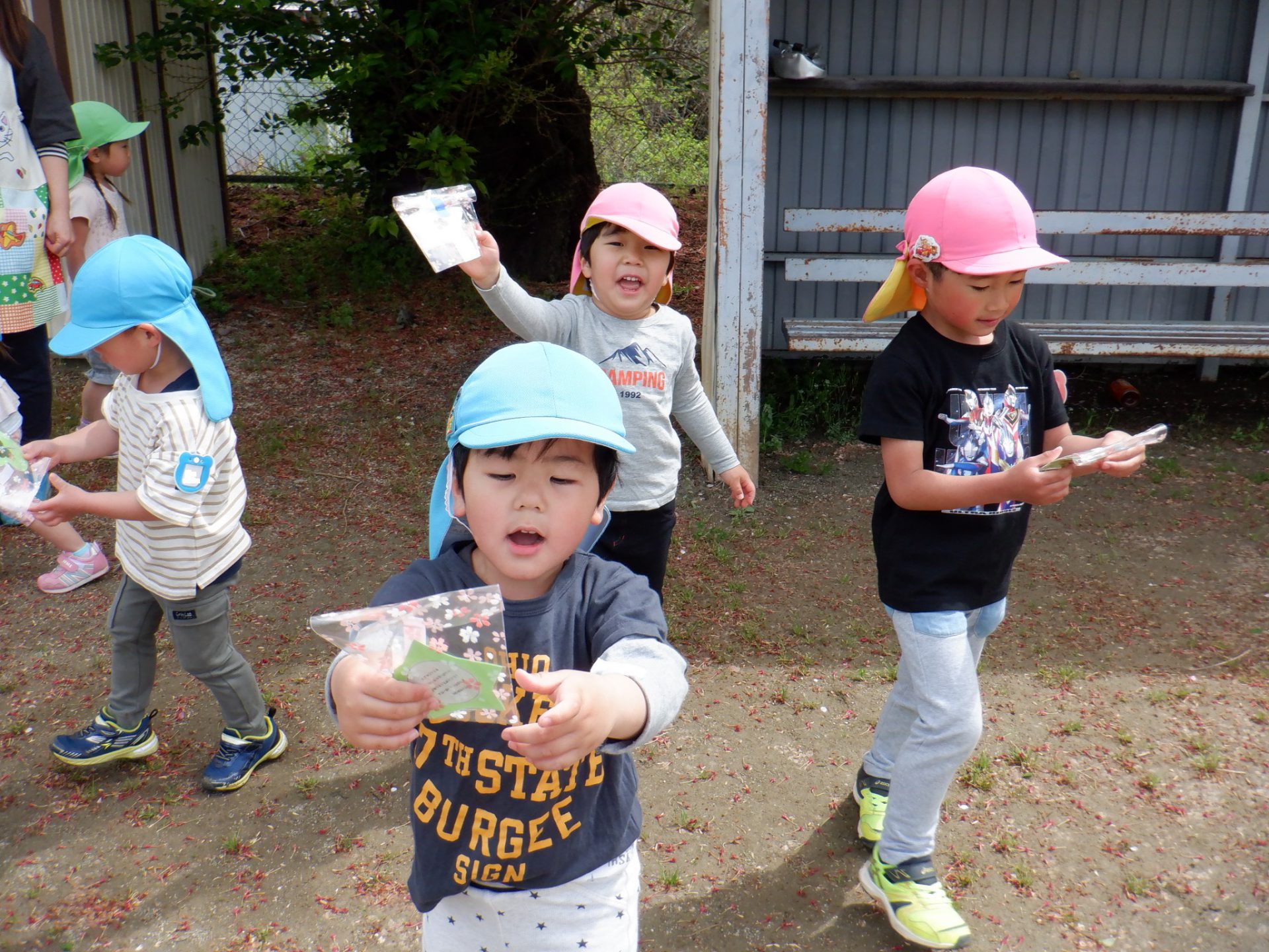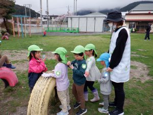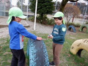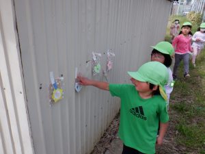 会の当日、小さい組さんに内緒で隣のグラウンドに隠しにいきました