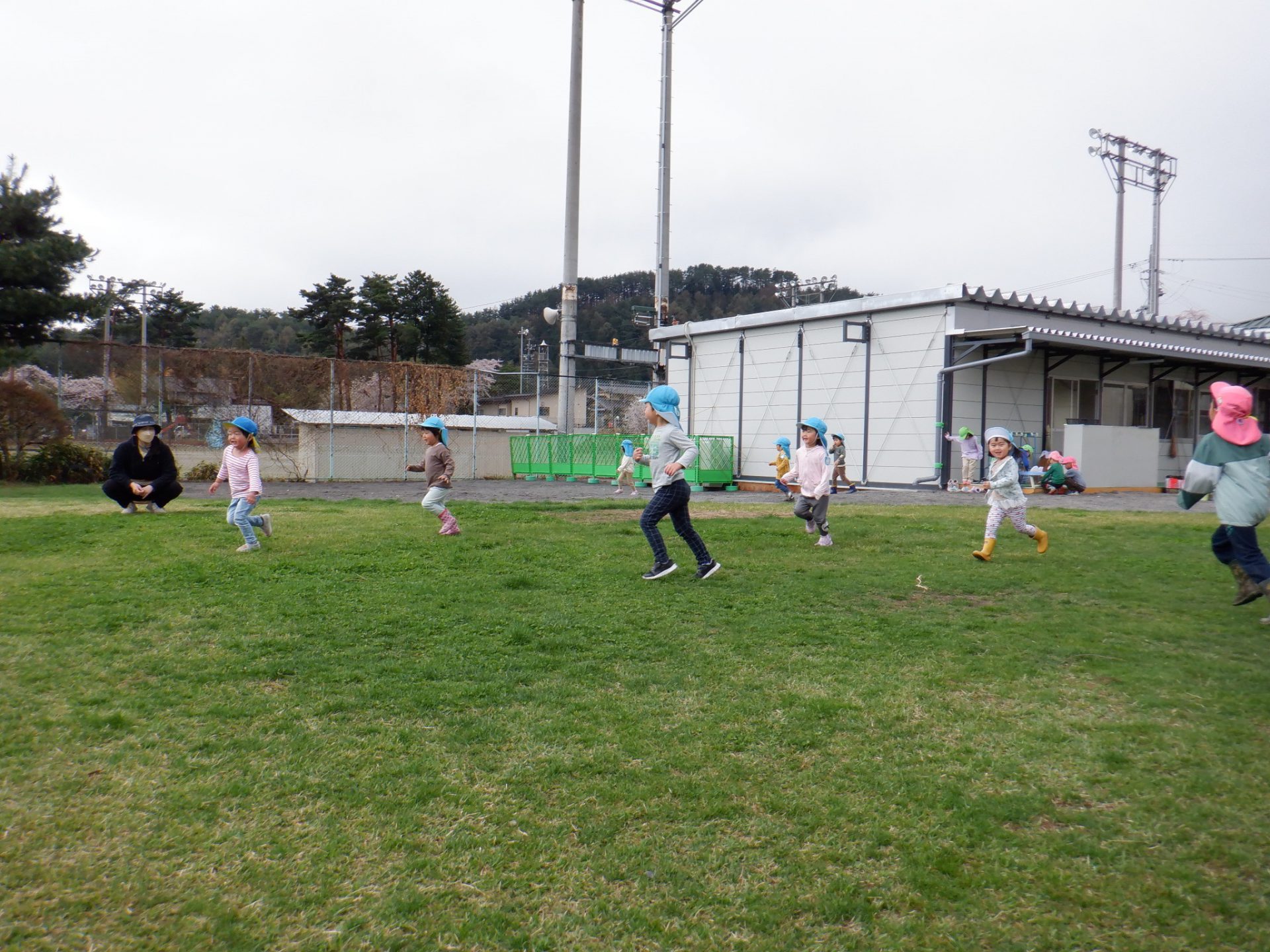 園舎建て替えにより、4月から本格的な仮園舎生活になりました。親しんできた園庭の芝生も遊び納めです