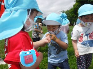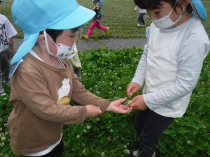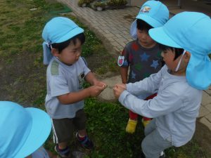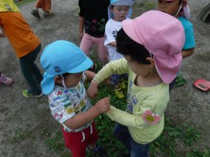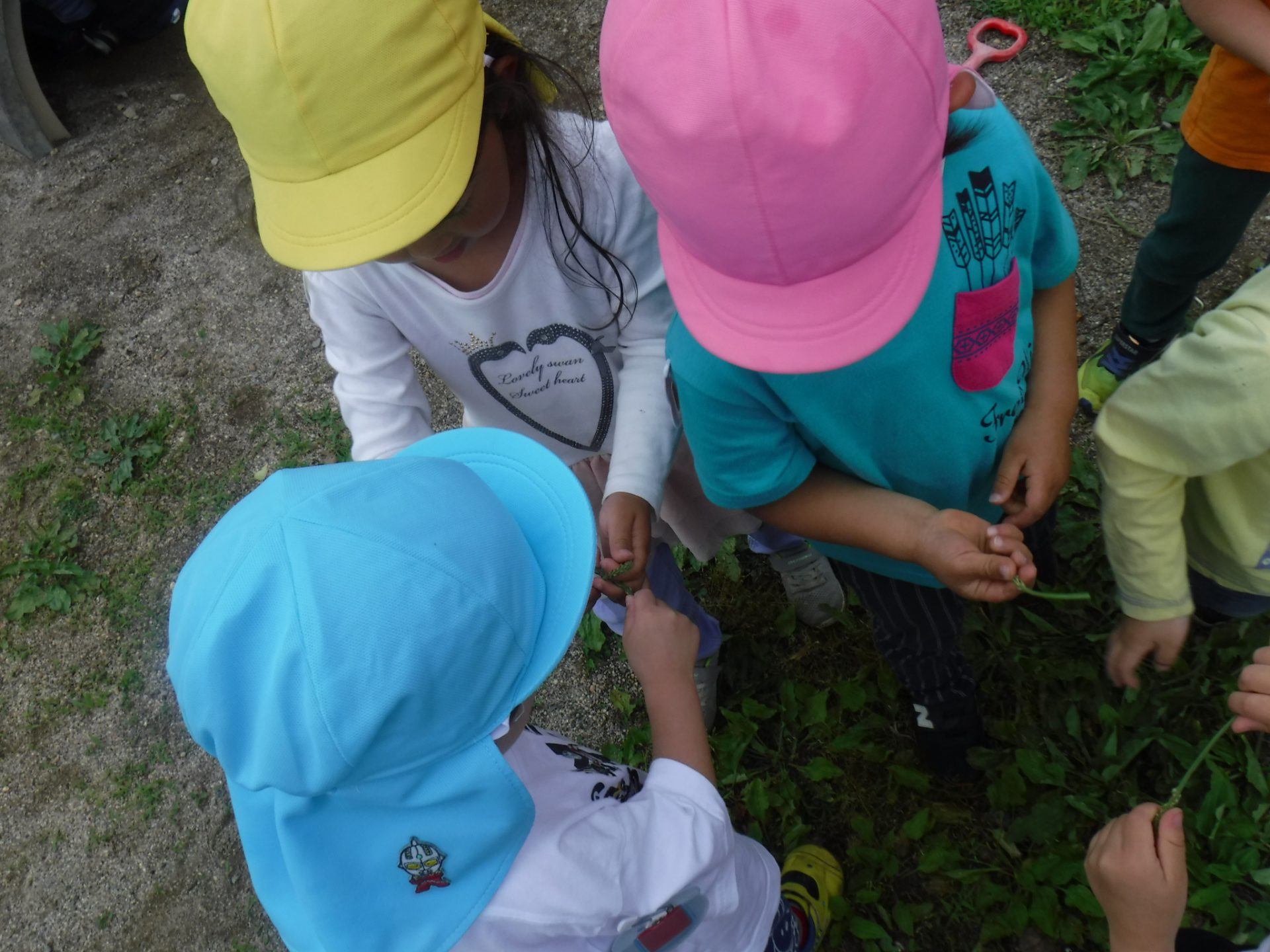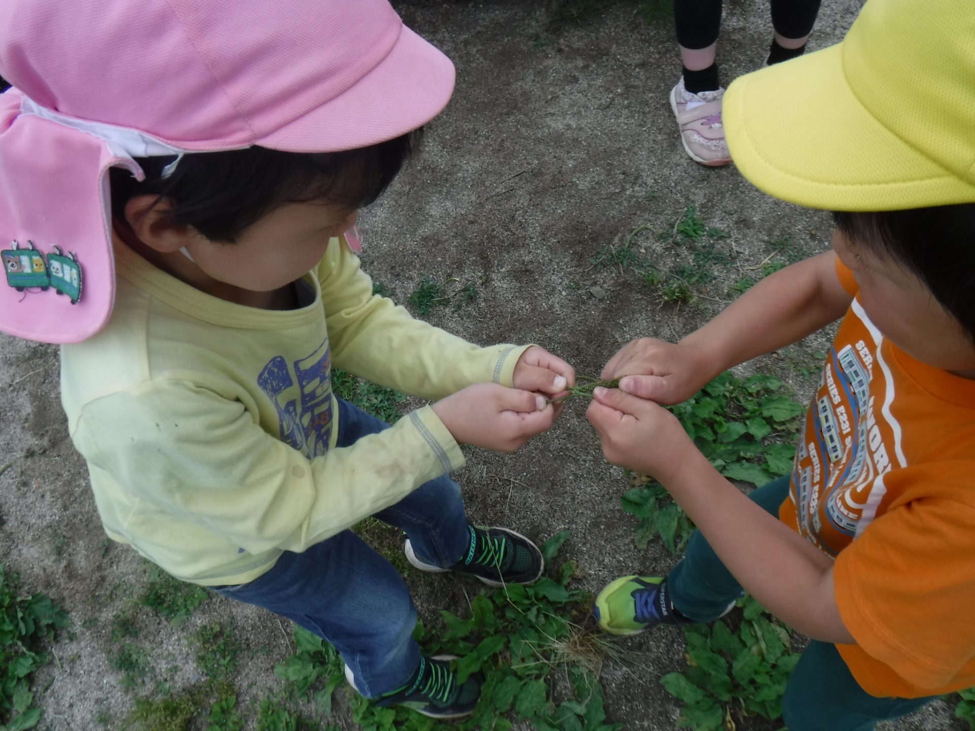 いつも身近にある草花にも名前があることや、それを遊びに使ってあそぶ楽しさを知っていく姿がありました。