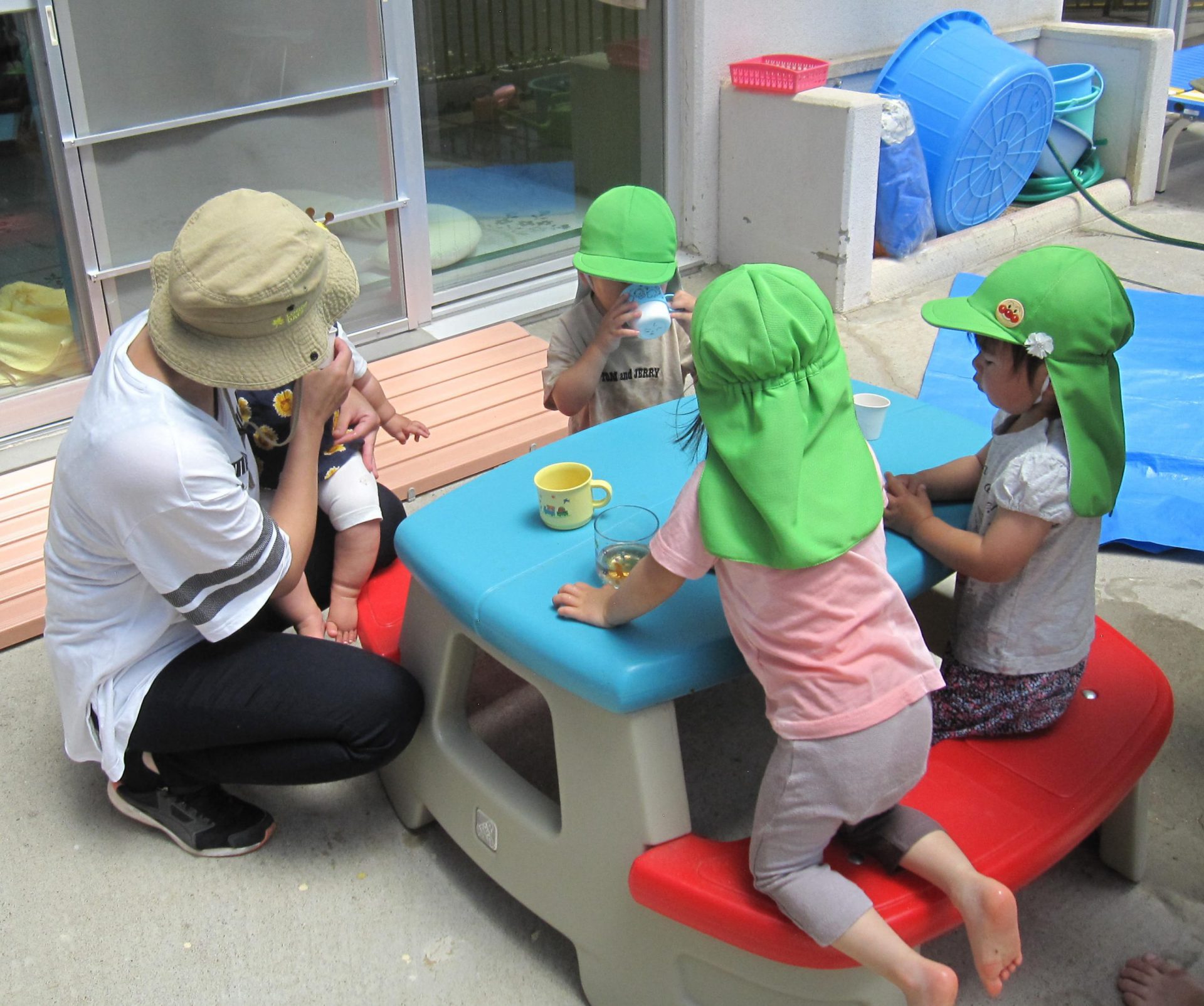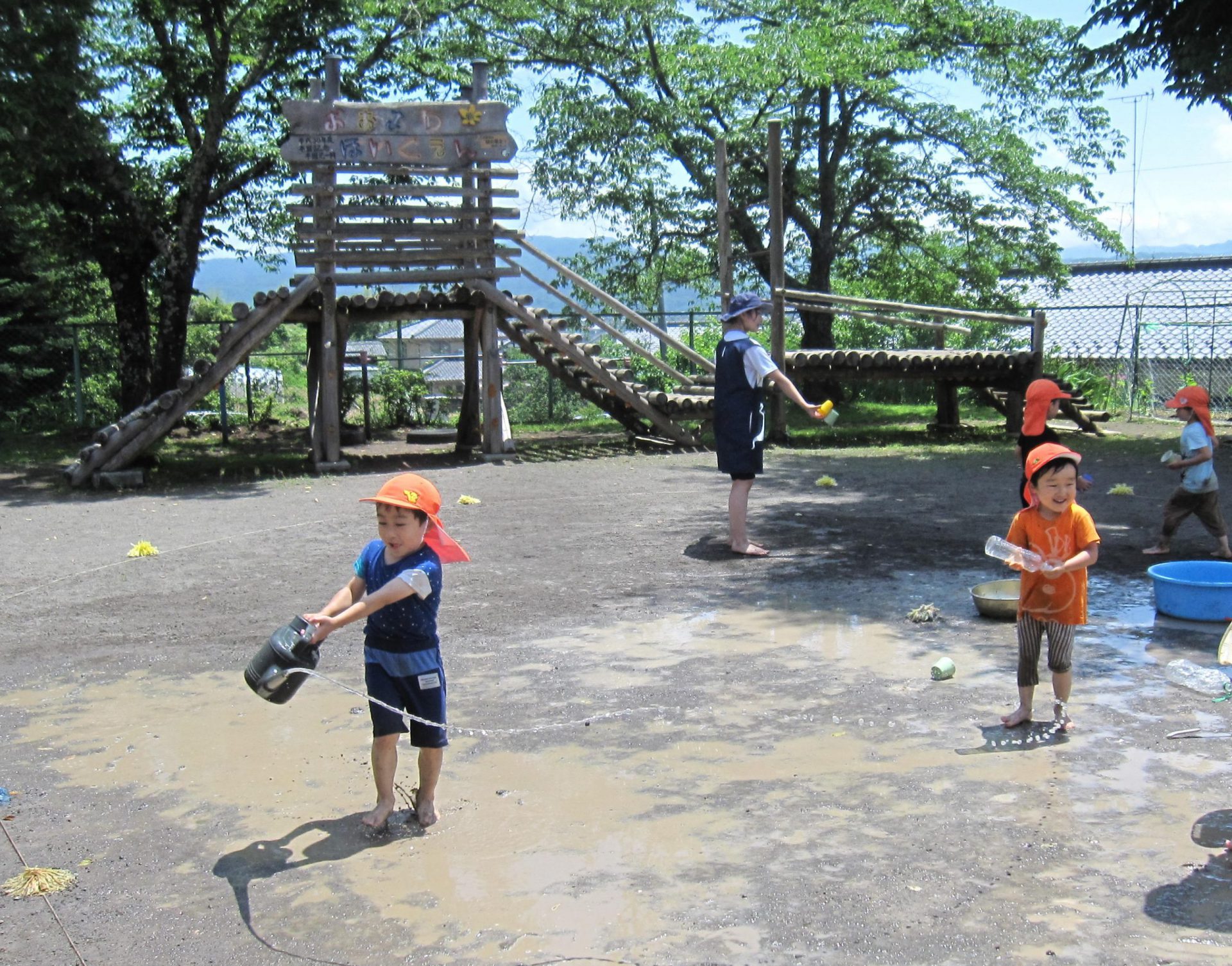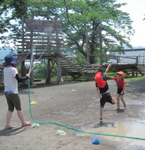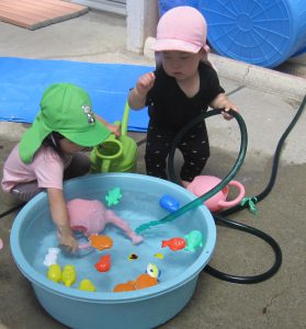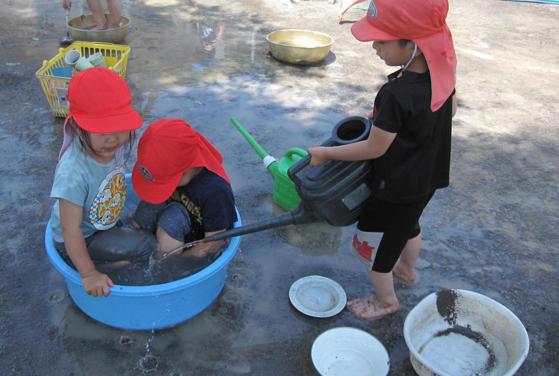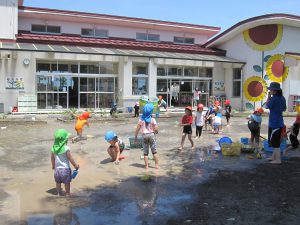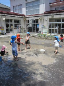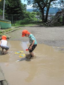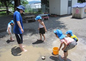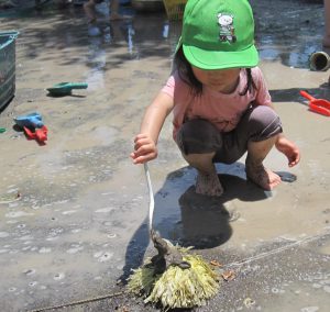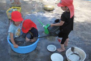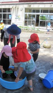 小さいお友達も、お兄さん・お姉さんと一緒に水や泥んこに触れて、異年齢でおもいきり楽しむことができました。