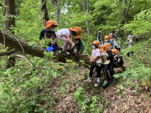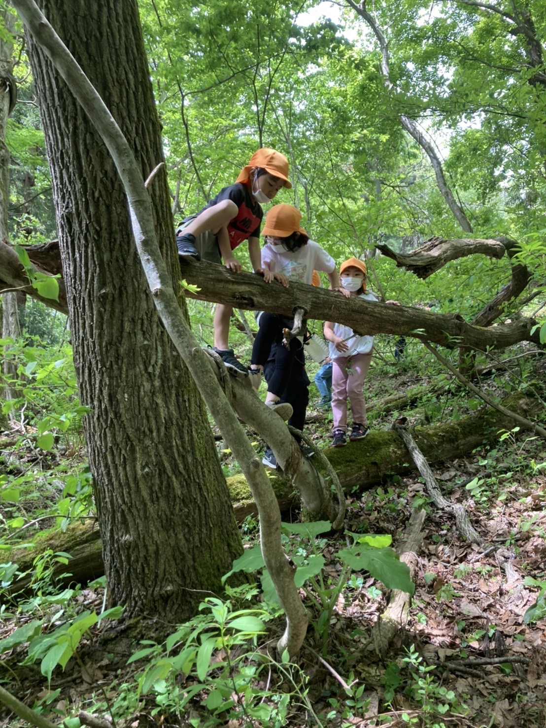 先頭になる子を順番で交代して遊びました。降りられなくて困っている子がいると支えてあげたり、他の子に声をかけたりしながら自分たちで安全に気をつけながら夢中になって遊んでいました。