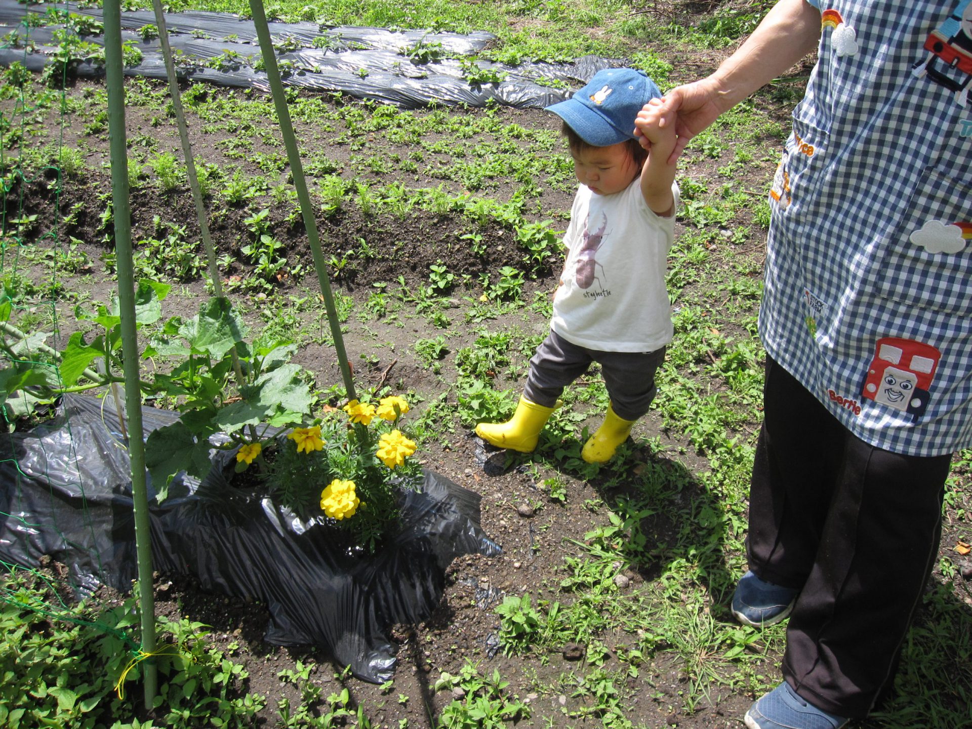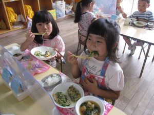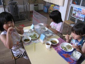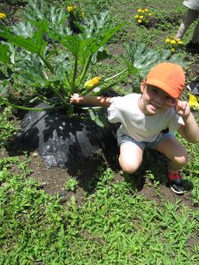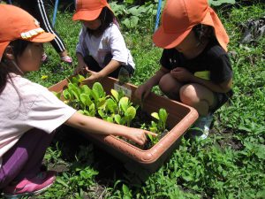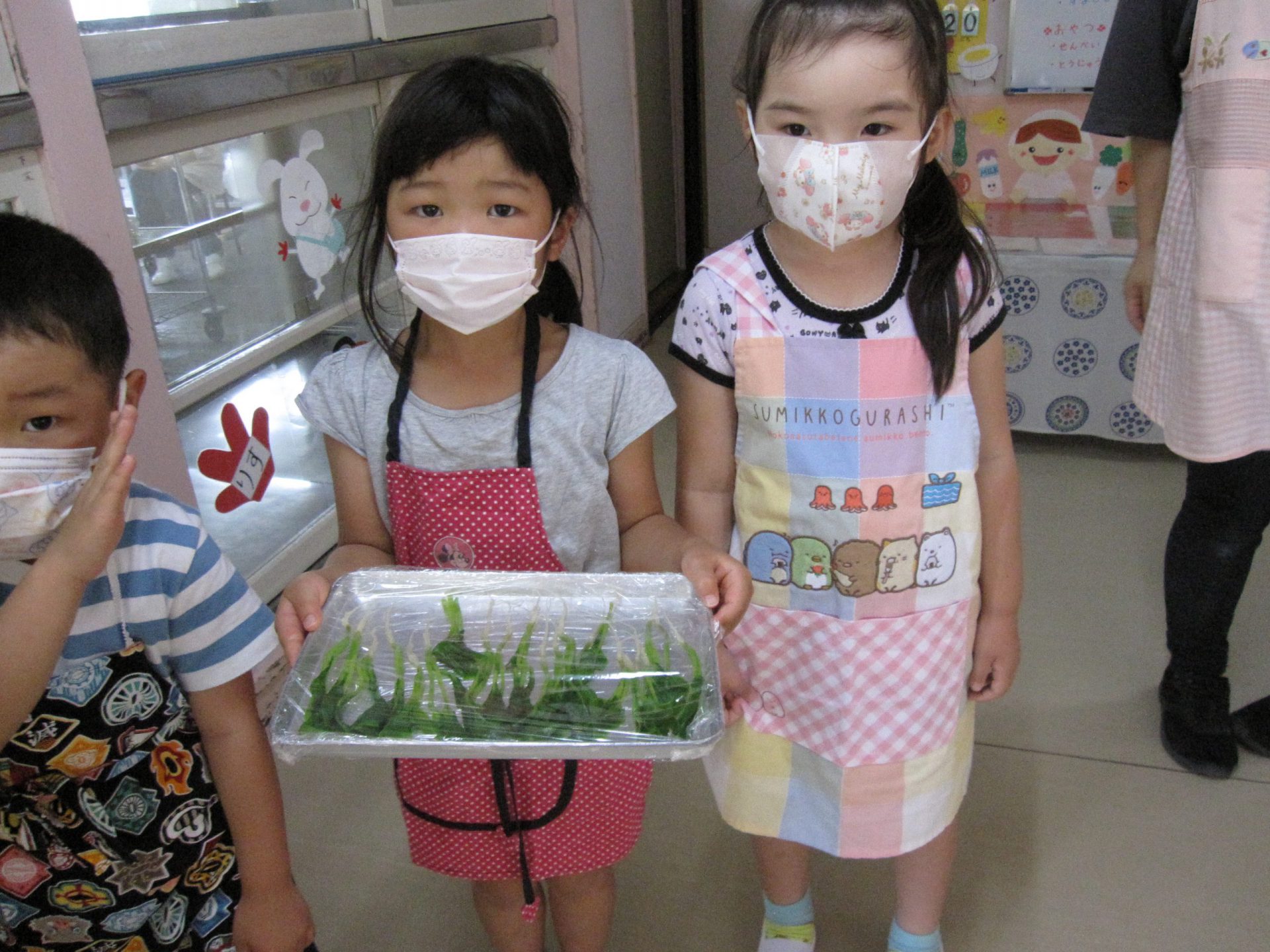 ①種を蒔く ②管理する(水くれ・草とり・看板つくり・生長観察・間引き) ③食べるという植物の生長の一連の経験ができました。給食の先生に協力いただいたお陰で、収穫した野菜をその日に食べ、「食」への関心がより高まったことと思います。以前も、収穫した野菜をスープに入れてもらった時も、収穫した野菜が区別がつくようにと、切り方を変えるという配慮していただきました。給食室の職員もしっかり子どもの立場に立って調理していただいていることを感じます。自園に給食室があり給食の先生がいることのありがたさを改めて感じます。