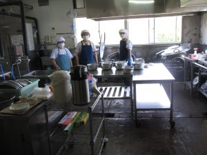 調理員「はいよ。給食に出すから楽しみに待っててね」畑の収穫野菜をいつも快く調理し提供してくれる給食室の先生たちです。