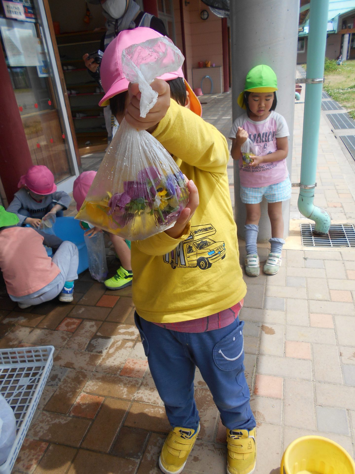 「僕も私もやってみたい!」との声から花の色水遊びに発展です。