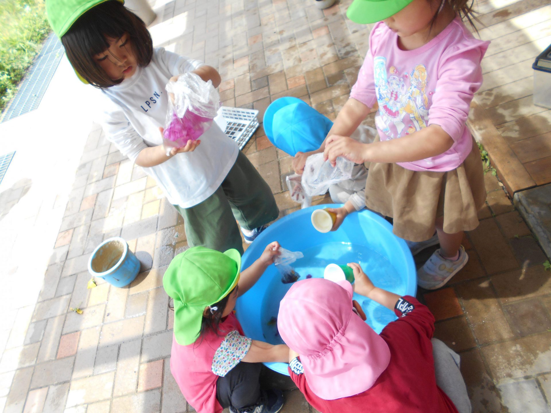 色水遊びを楽しむ中でどうやったら色が出るのかを試行錯誤していた子どもたち、水が多すぎると色が出ない。