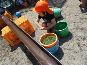 園庭に生えている草をそうめんに見立てて流していましたよ。