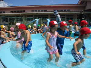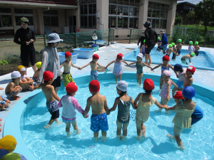 と、待ちに待ったプールに大喜びの子ども達。しっかりとプールでの約束をし、みんなでお清めも行いました。