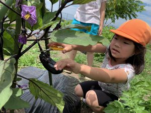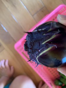 そんな中、「先生、ナスのとげって何であるのか知ってる?」とRちゃん。「Rちゃんは知ってるの?」「うん!守るため!!そうSくんが言ってたし!!」お友だちとの会話から、しっかり学んでいるんだね。