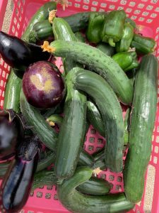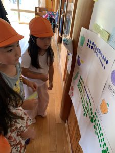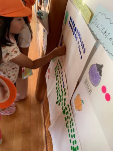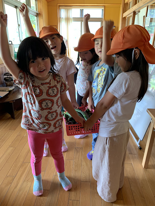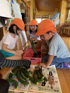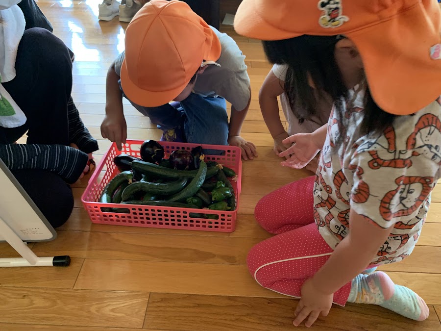 「始めはきゅうりね」Nくん、率先して野菜を数えていきます。「1.2.3.4…..12.13.14.15!今日の方が少ない!」そう言って、昨日の収穫の本数と比べっ子。(昨日は最高記録!30本採れたんです!!)友達と確かめながら、数への関心が高まっていくなと感じます。