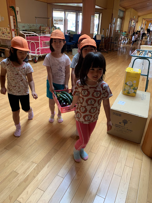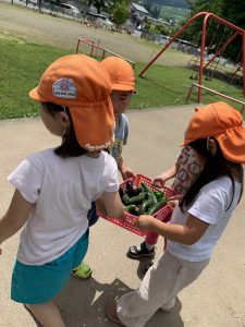 「うわーいっぱい採れたね」そう言って喜んで受け取ってくれるお料理先生♡数えた野菜の数を自然に伝える子ども達の思い、忙しい時間を割いて耳を傾けてくれるお料理先生に感謝です。