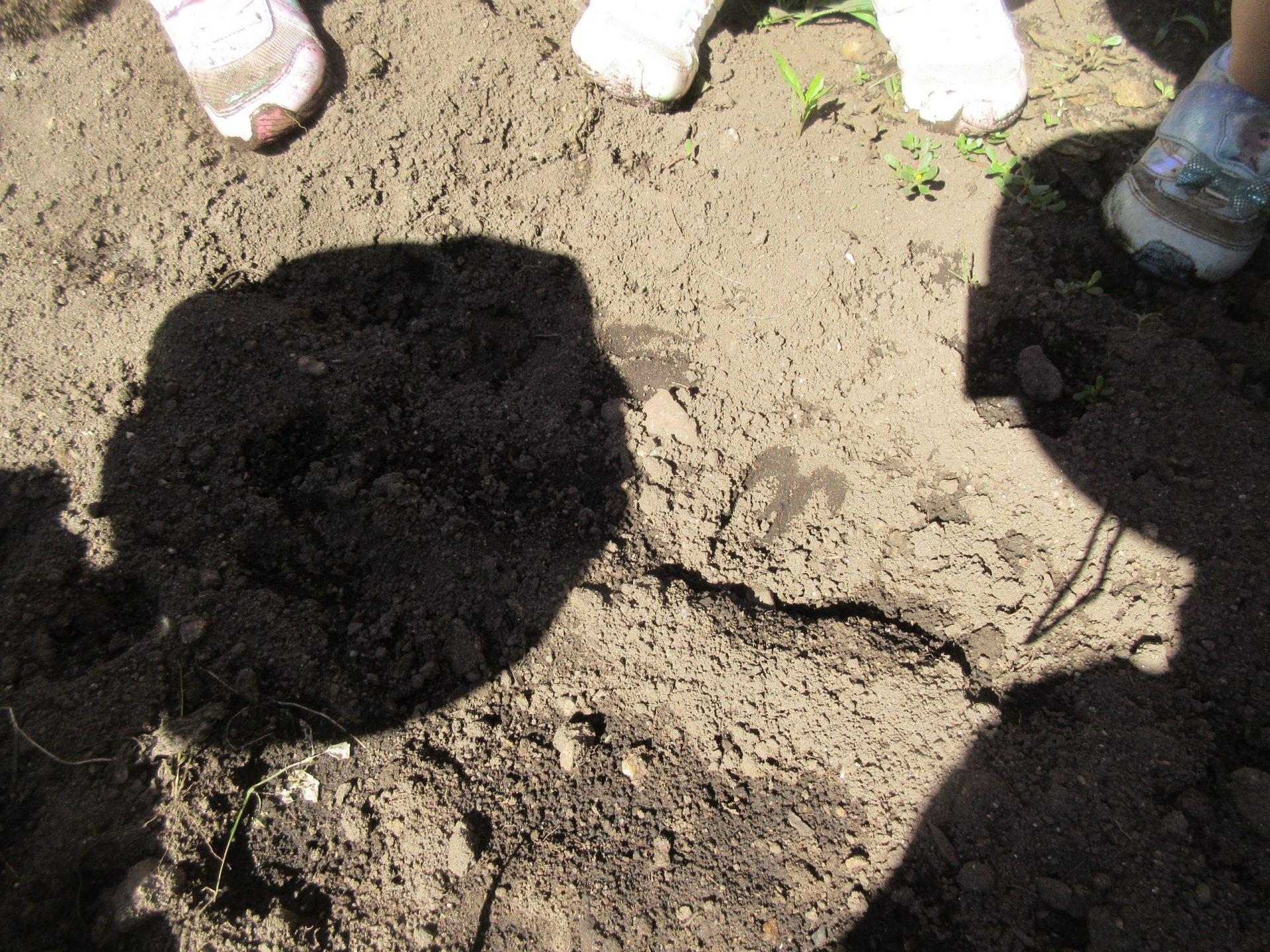 一週間に一度、草取りや、年少・年中組さんのポップコーン植えなどで、足を運んでいた畑でしたが、畑を見るとさつま芋の苗や、花を咲かせていたジャガイモは葉を食べられ、土を掘り起こされ食い散らかし、ポップコーンの葉も何本か食べられていました。