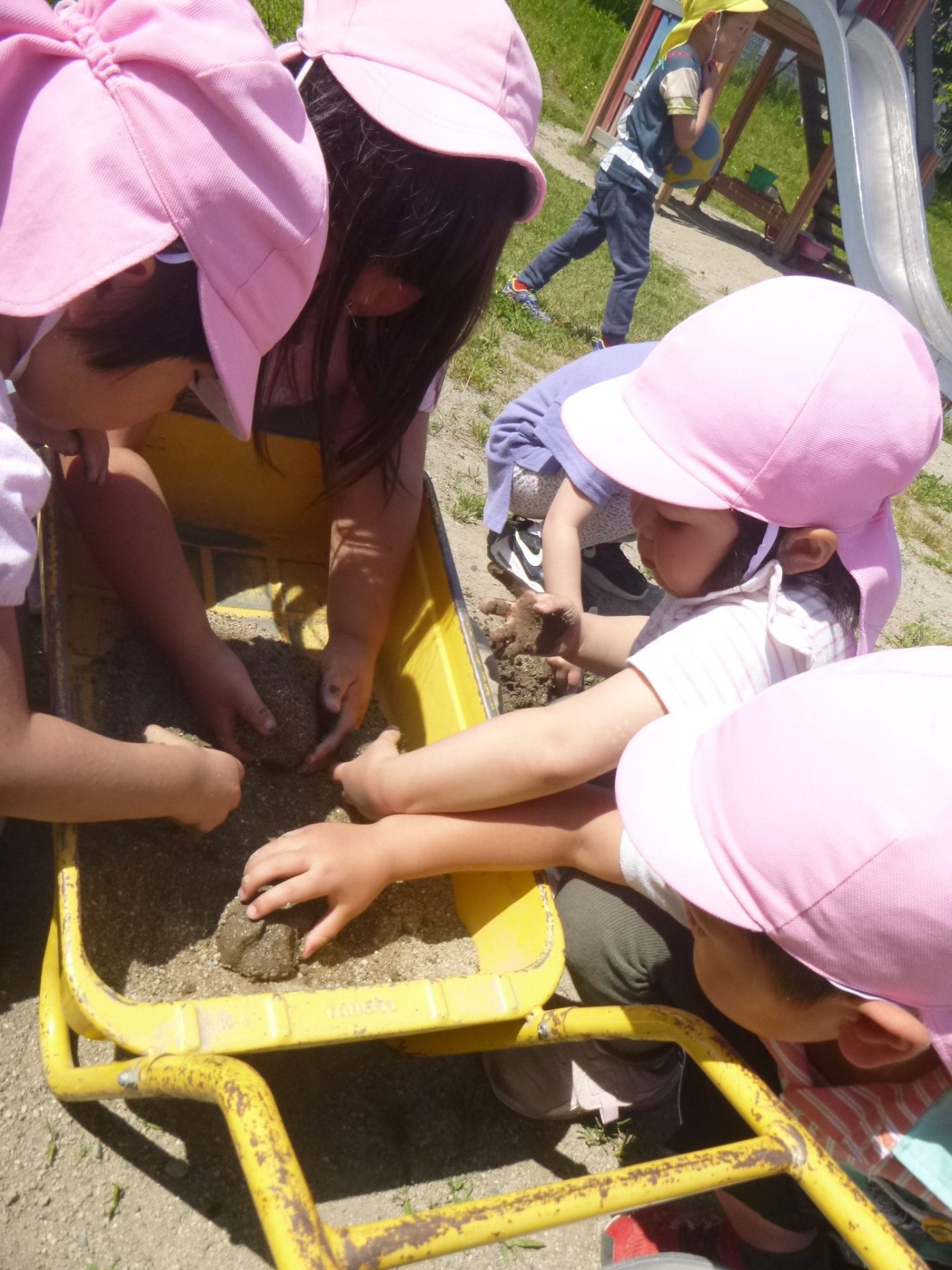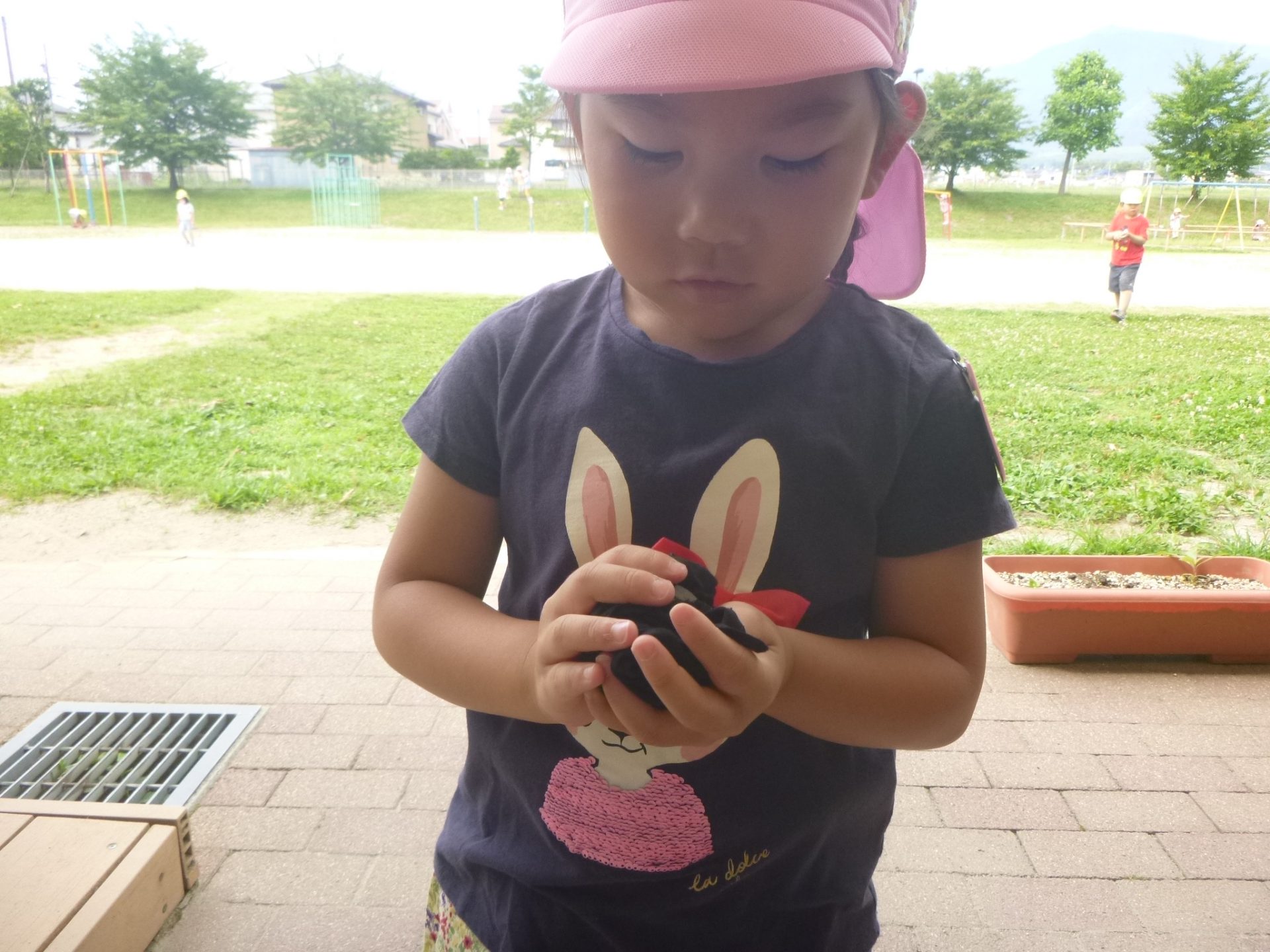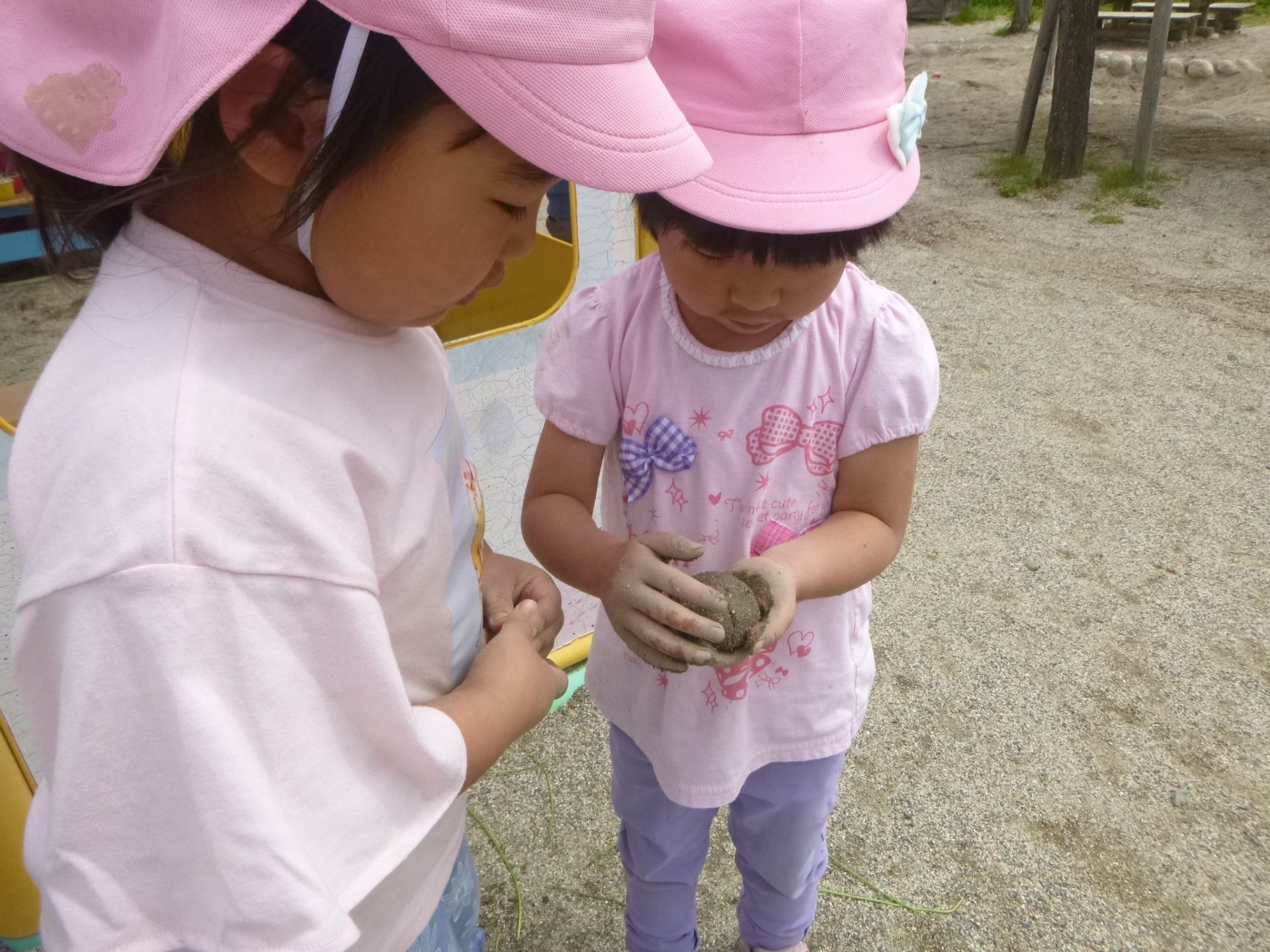 作る過程で泥だんごにヒビが入ってしまったり、水を入れすぎベチャベチャになってしまったり‥と、苦戦する姿もありましたが、その都度考えてやってみようとする姿が見られました。