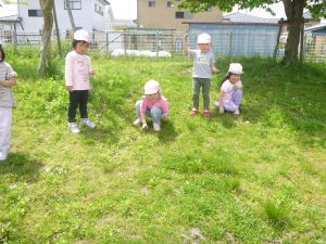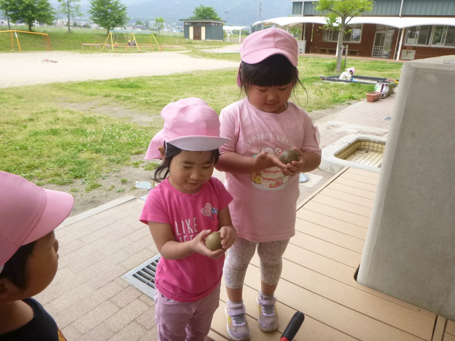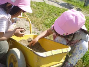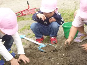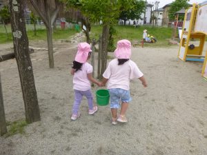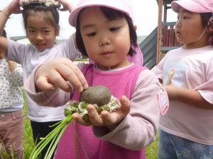 「泥だんご作りたい!」「固くてピカピカの泥だんごにする!」と言い、園庭に向かいました。