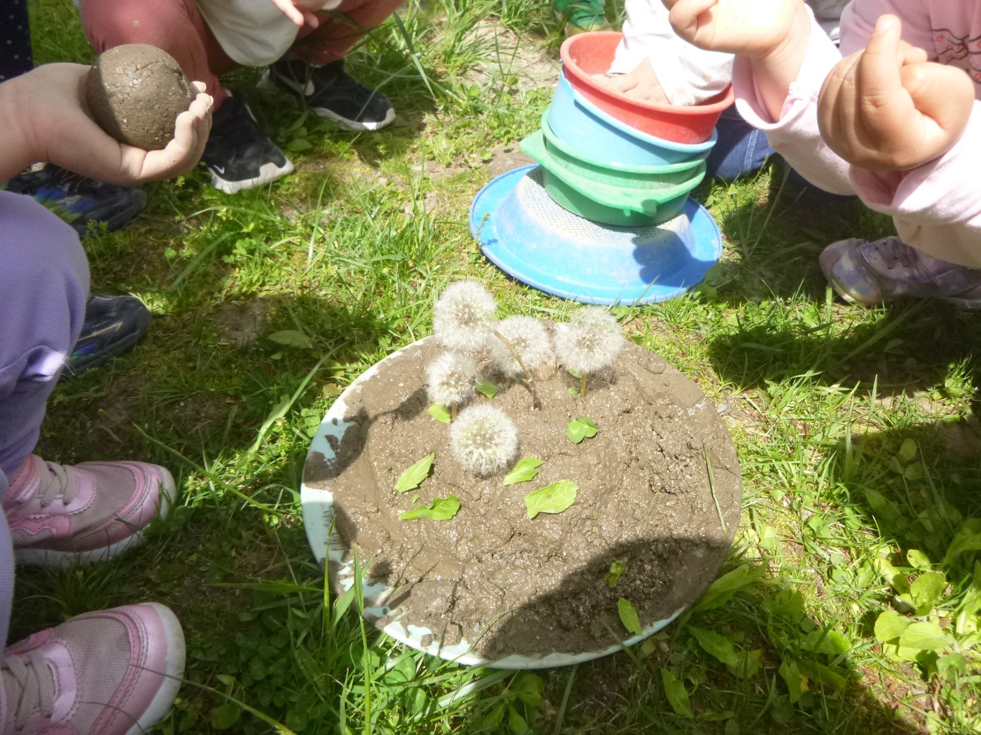 水や砂、泥を使って「桜餅どうぞ」「チョコレートケーキの完成!」などと
