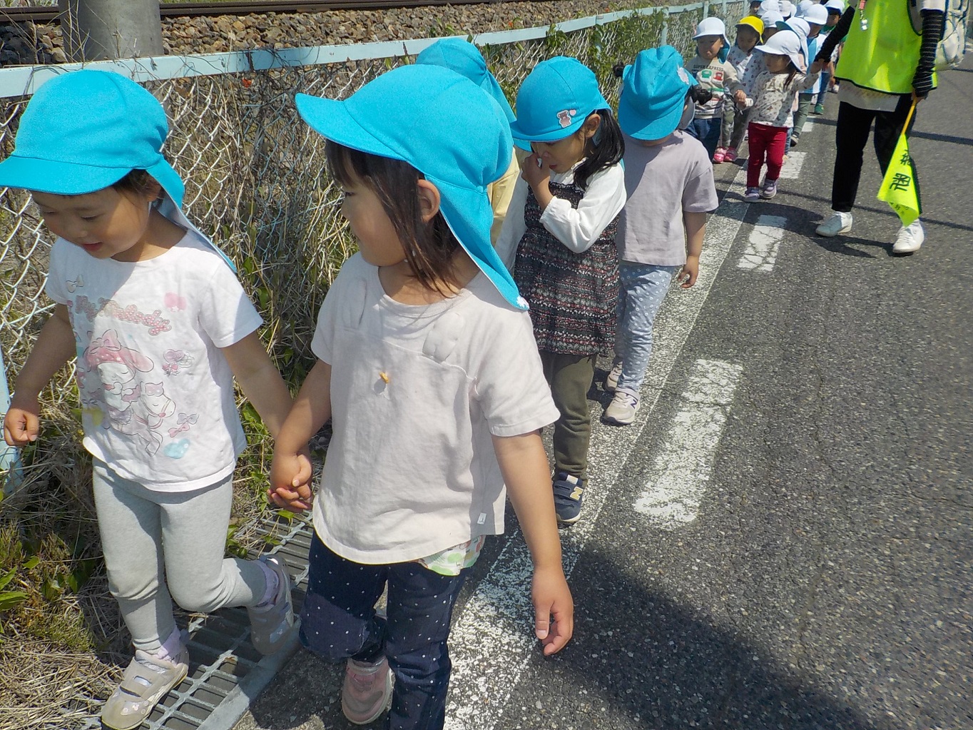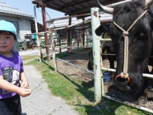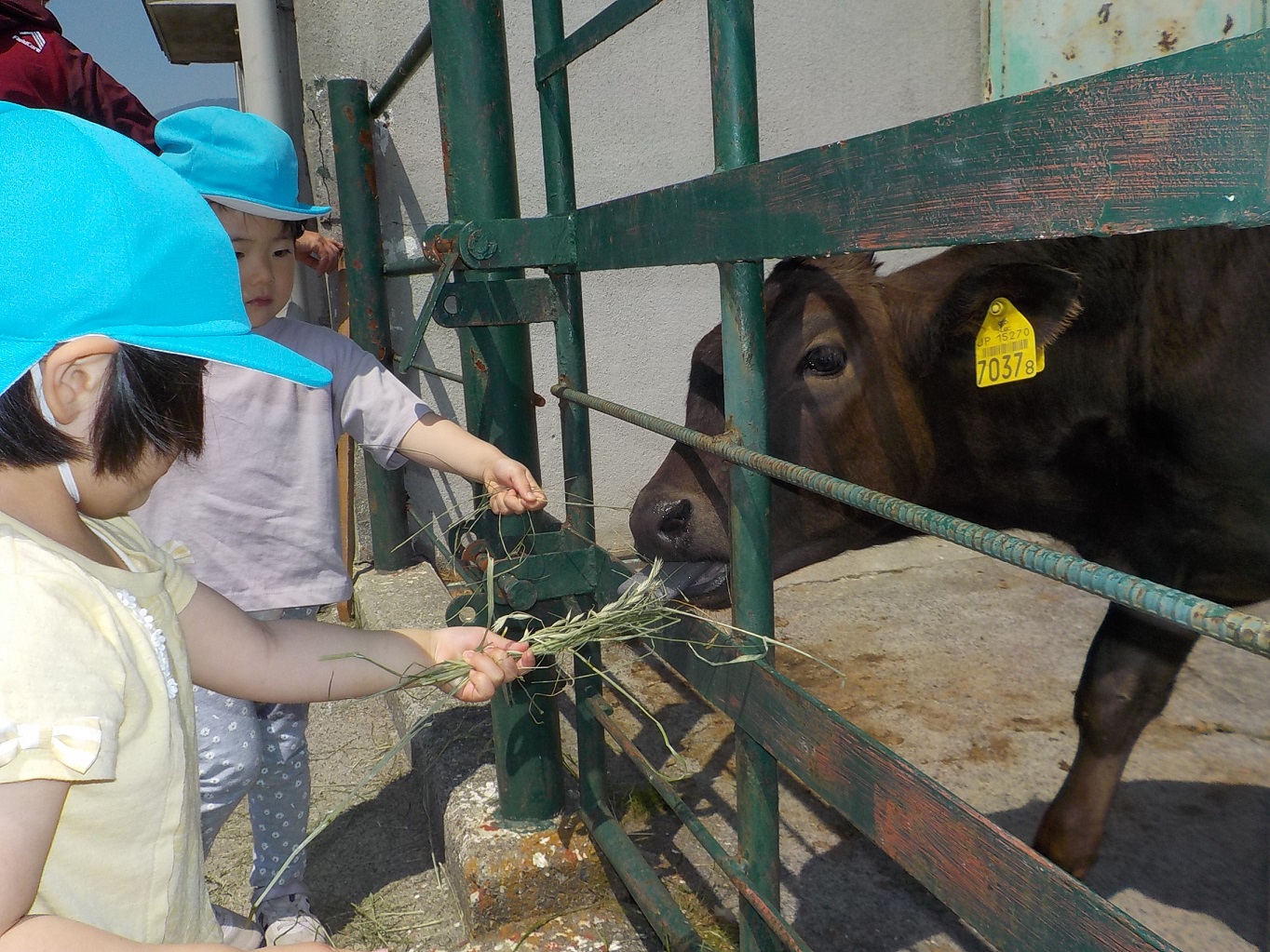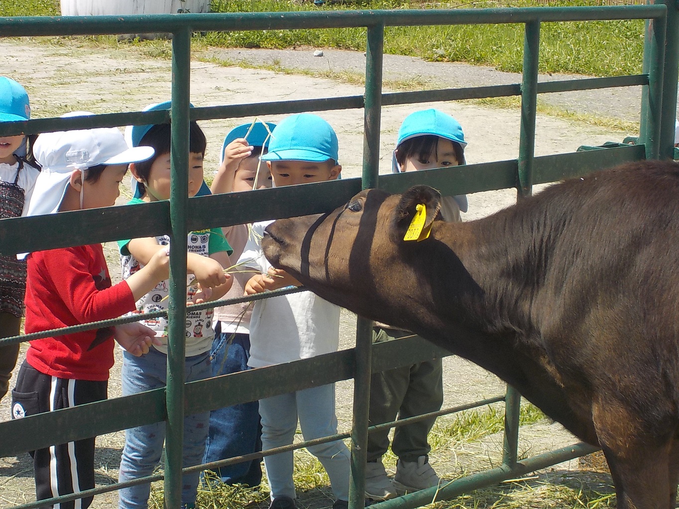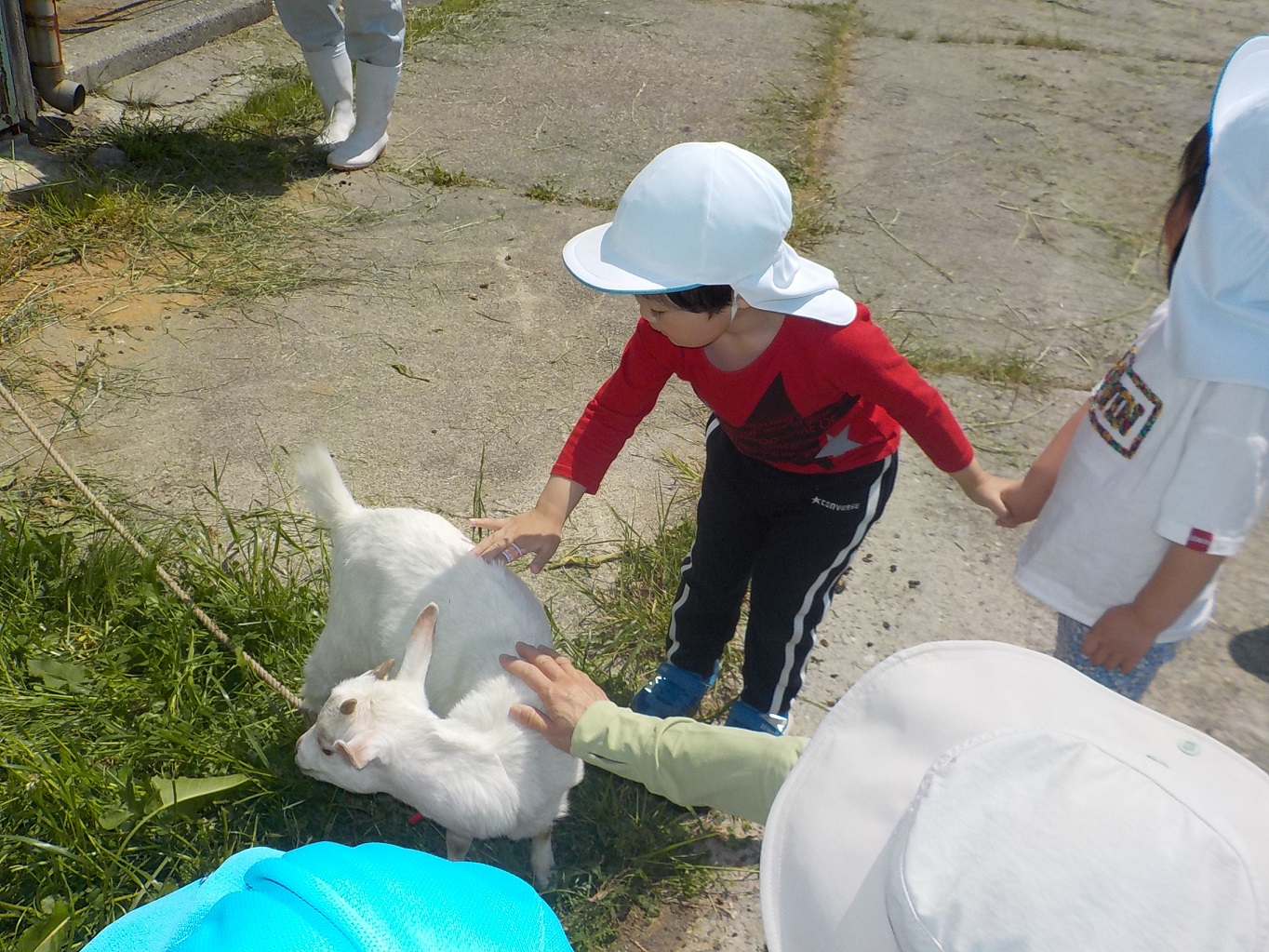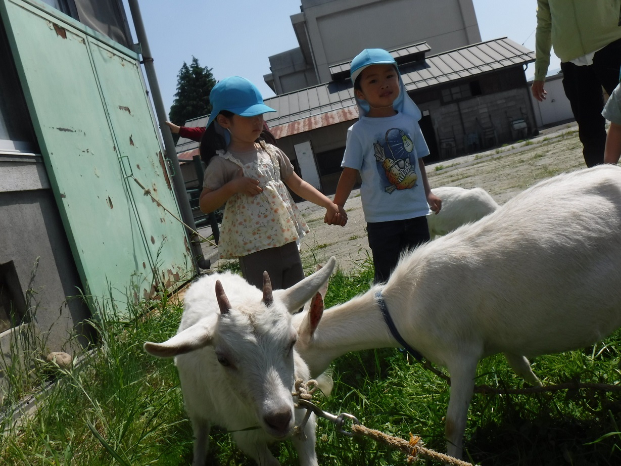 年少になって初めての遠足、歩いて着いた先には牛やヤギがいて、大喜びの子どもたちでした。動物たちの動きに目をキラキラさせる子も、少し怖くて距離を取る子もいました。