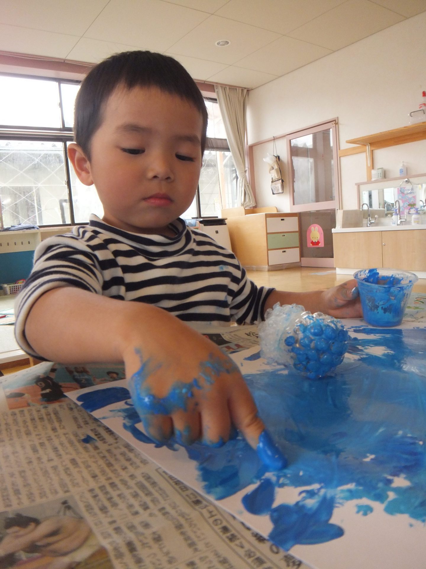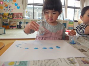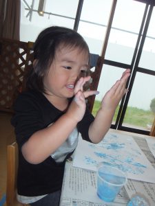 最初はスタンプを使って遊んでいましたが、いつの間にか指にかわり、夢中になっています。
