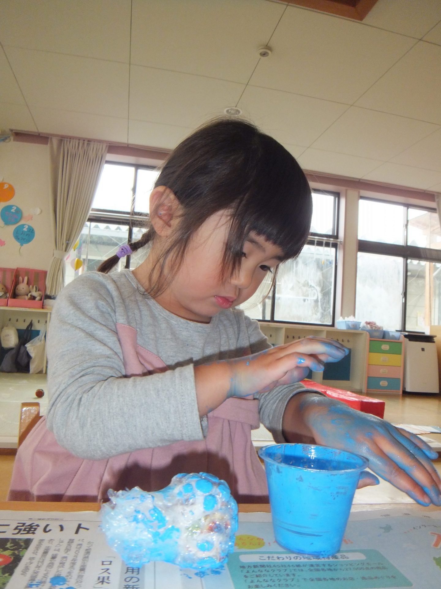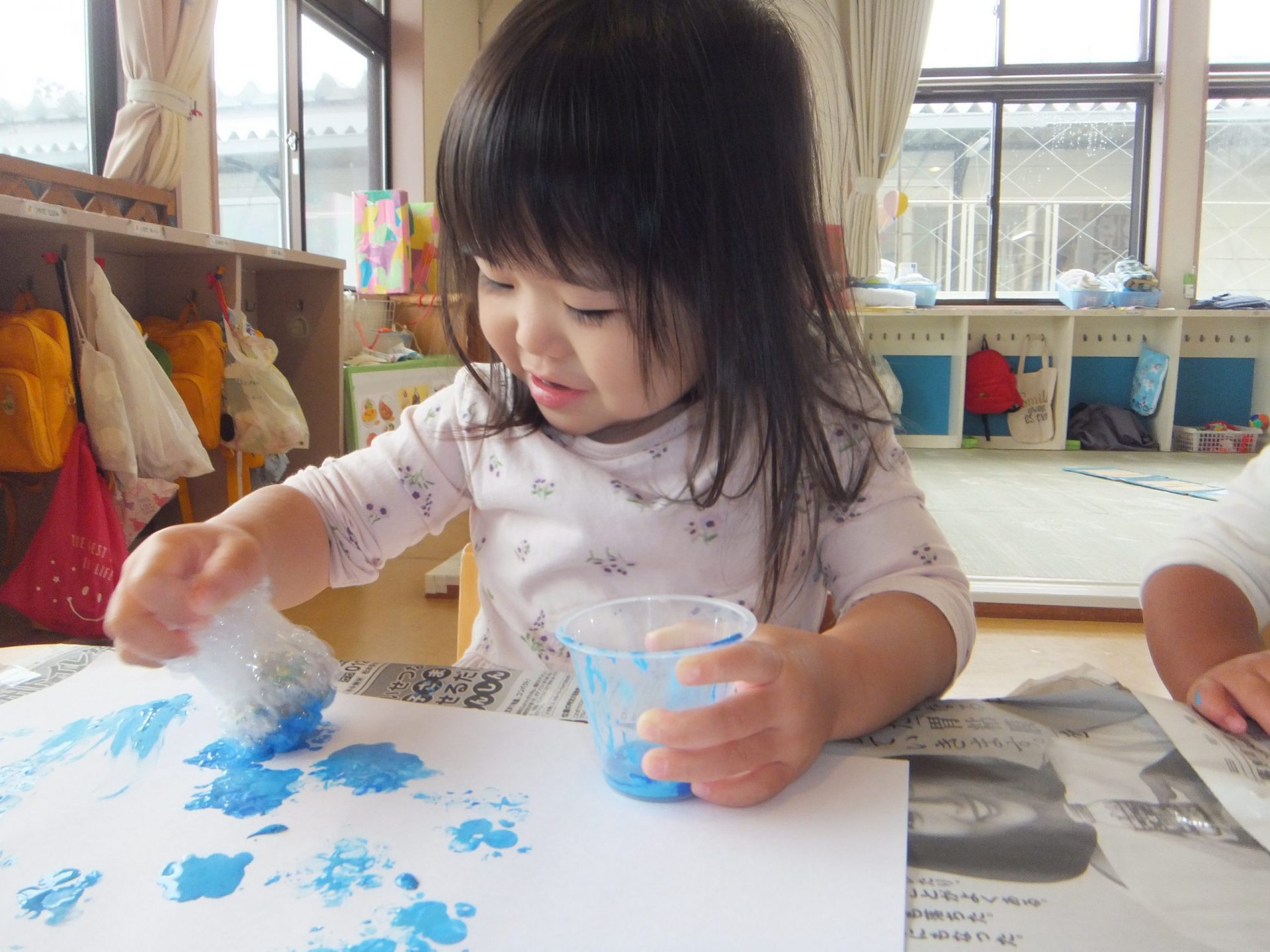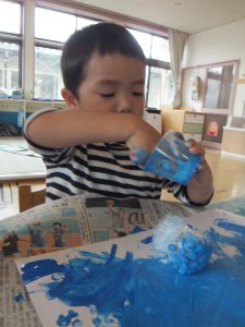 子どもたちが朝から自然を観察し雨を感じるつぶやきより、室内でもつながるような遊びをと、えのぐを出してみました。