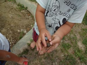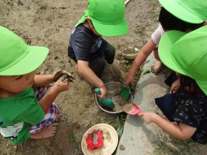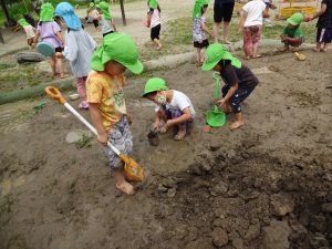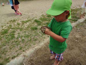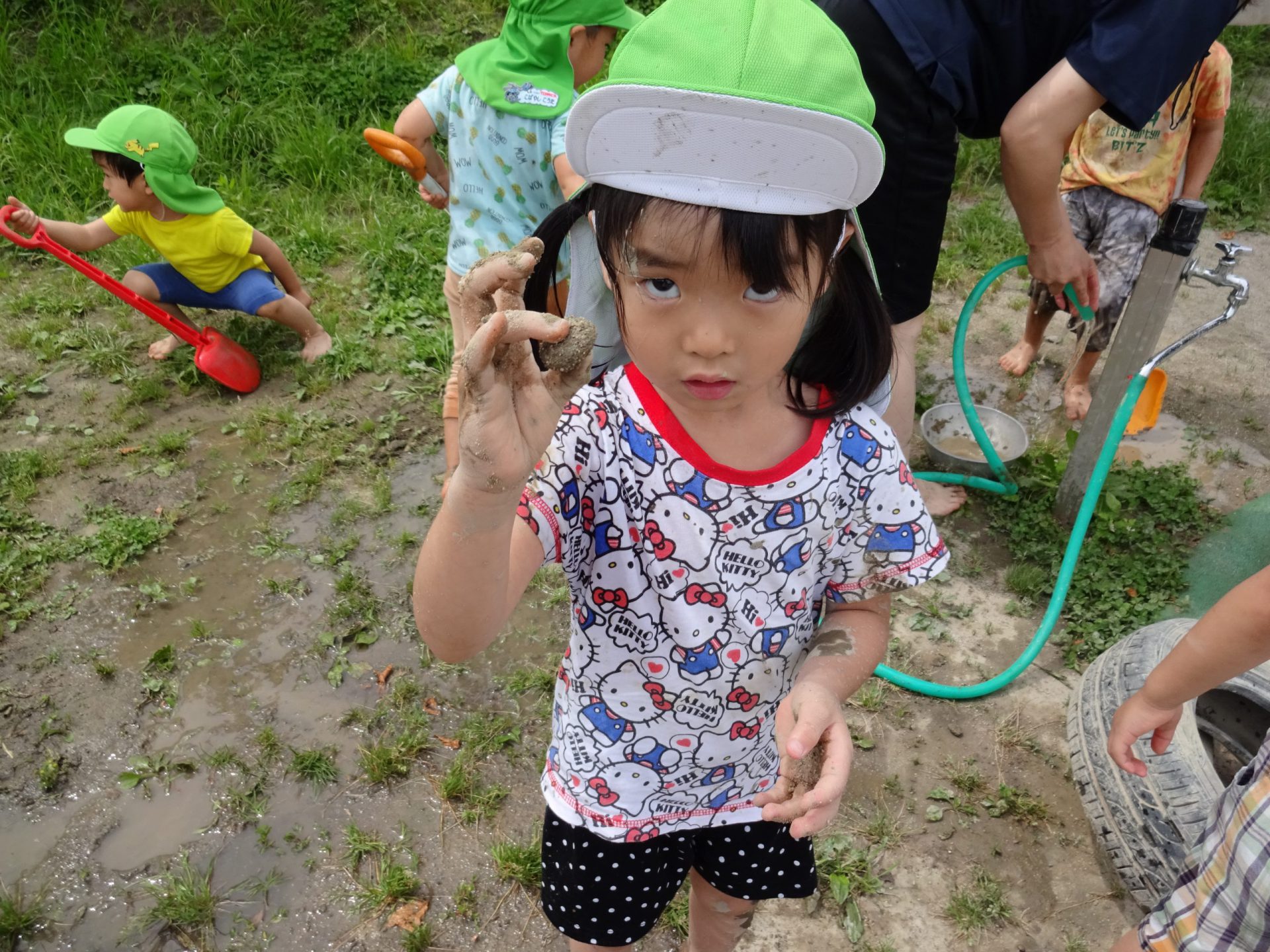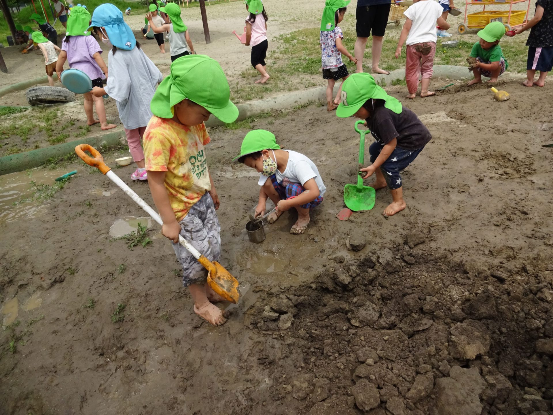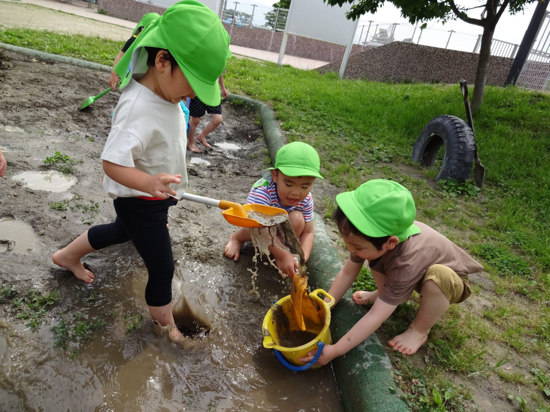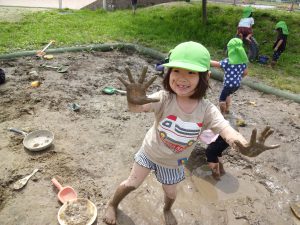 年少さんにとっては初めての泥遊びでしたが、子ども達が自分で考えて、工夫して、好きな遊びを 体も服も泥だらけになりながら、めいっぱい楽しむことができました。 体を思いっきり動かして、水、砂、泥の感触を全身で楽しむ事ができたのも良かったと思います。