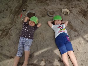 「冷たーい」「きもちいいー」など、砂のひんやり感も感じていました。
