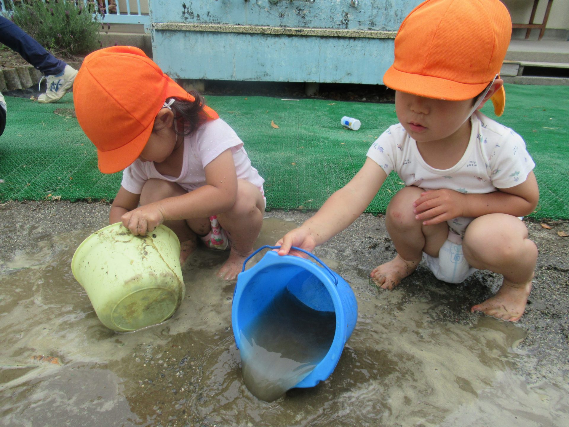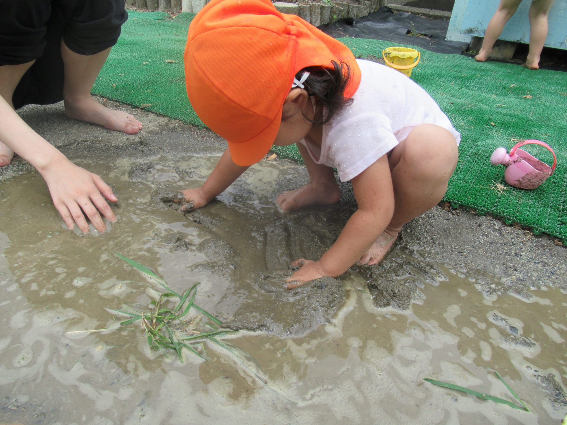 | 地面に水たまりができ泥んこあそびを始める子が出てくる。手や足で泥の感触を楽しんだり“たんぼ”に | ||||||