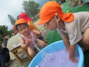 | 次から次へと自由に遊びを広げ、様々な形で水遊びを楽しめていました。 | ||||||