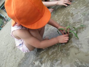 | 見立てる子がおり、「田植えをしようか」と草をイネに見立てて泥に埋めたりする。 |