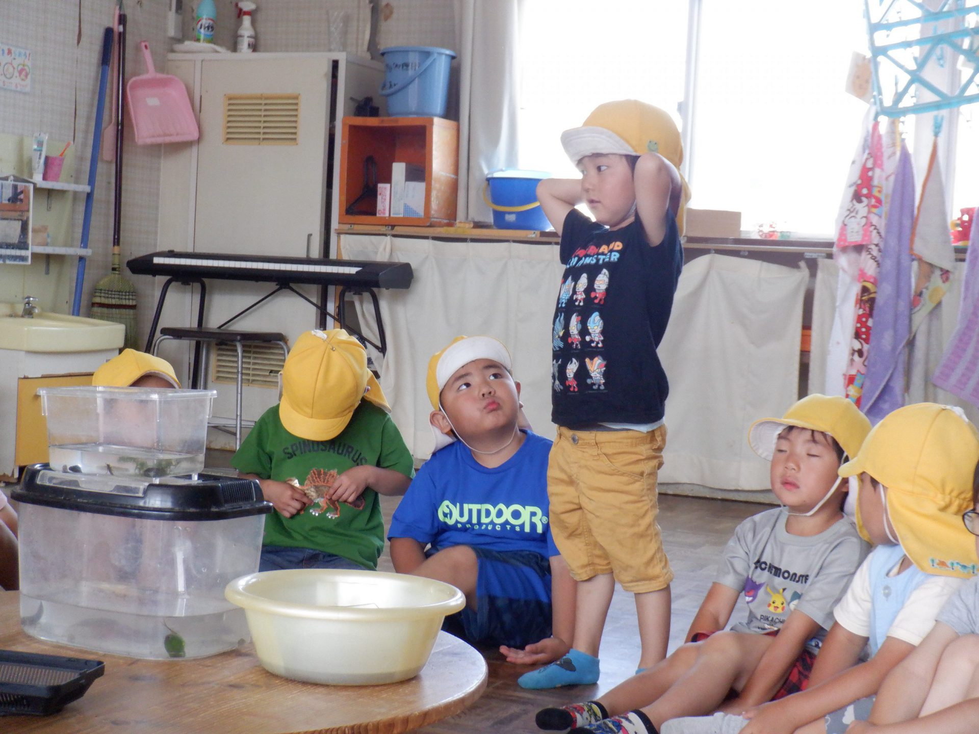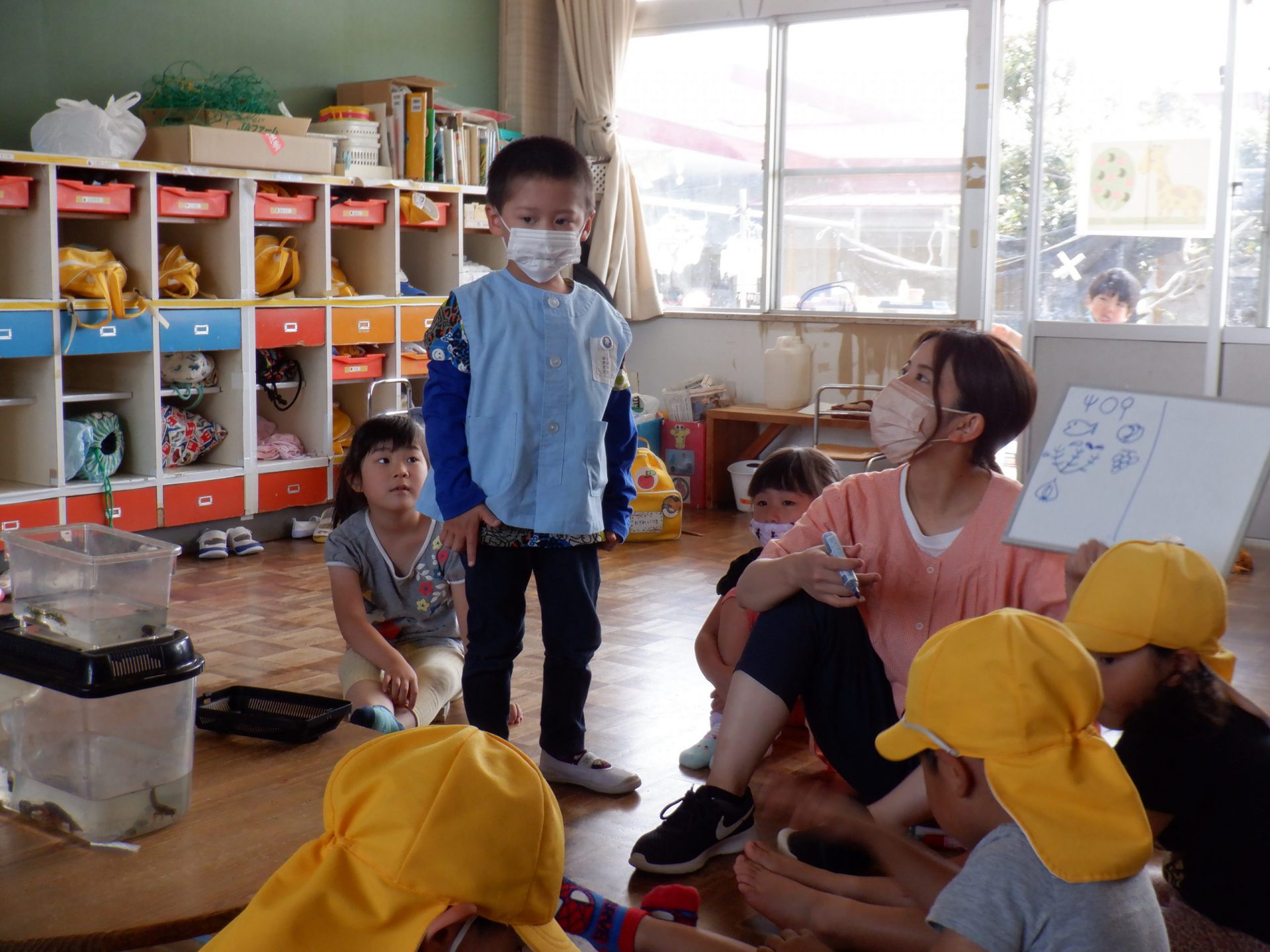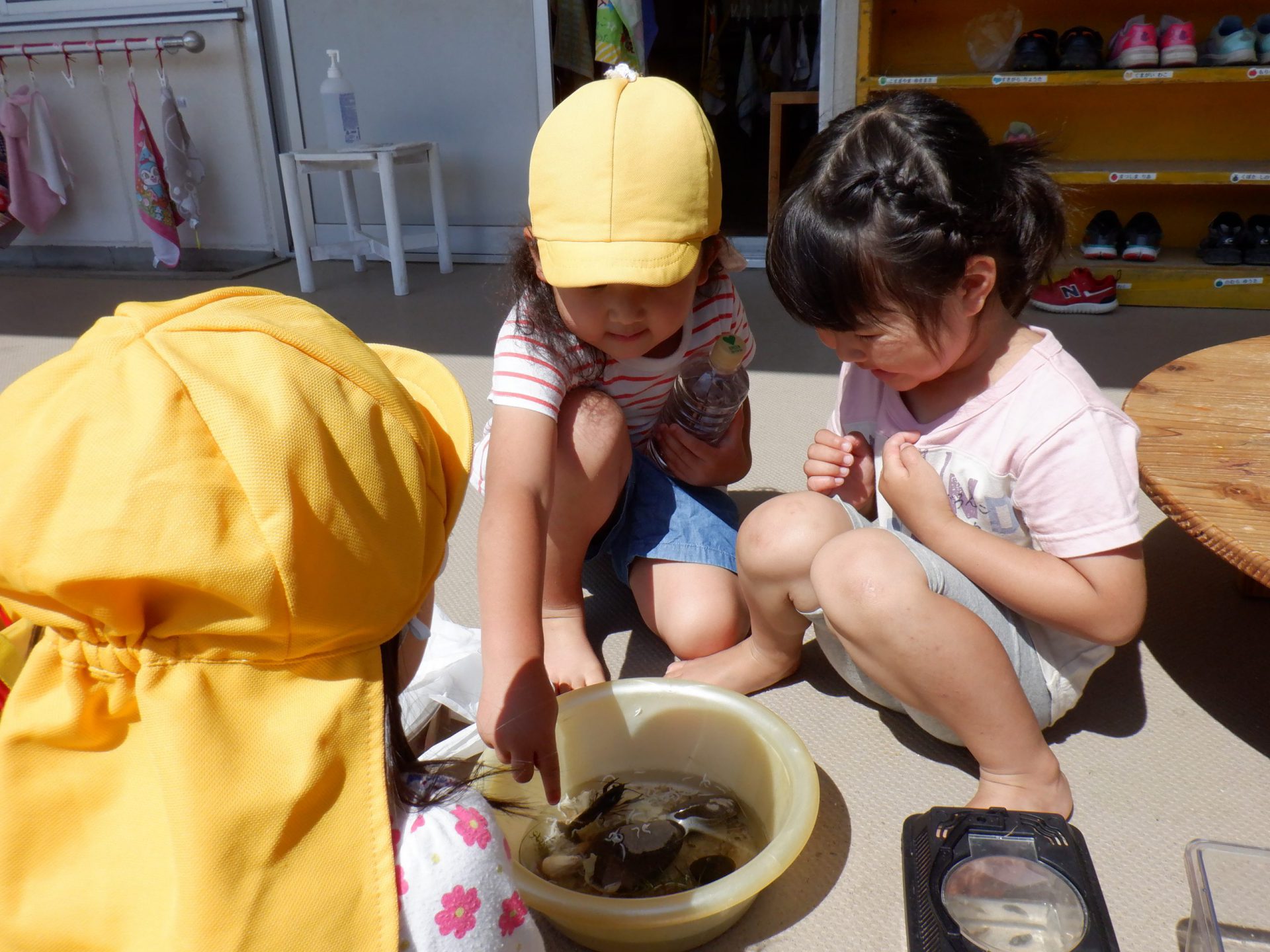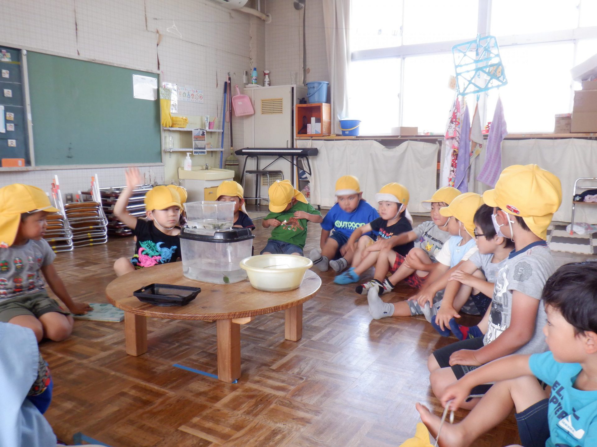 捕ったザリガニをどうしよう?と投げかけると「飼いた~い。」の声、でも飼うにはどうしたらいいのかなぁ?