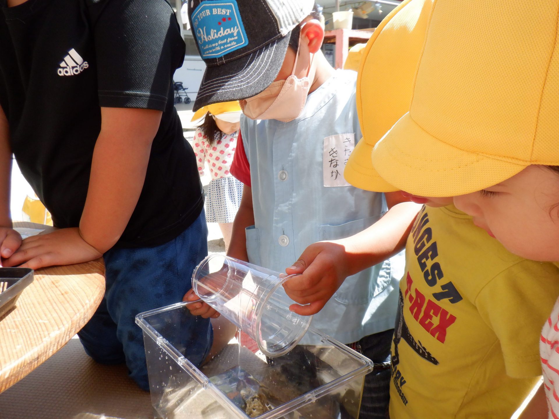 それぞれが家から持ってきた餌をあげてみたり、透明なコップでトンネルを作ってあげました。