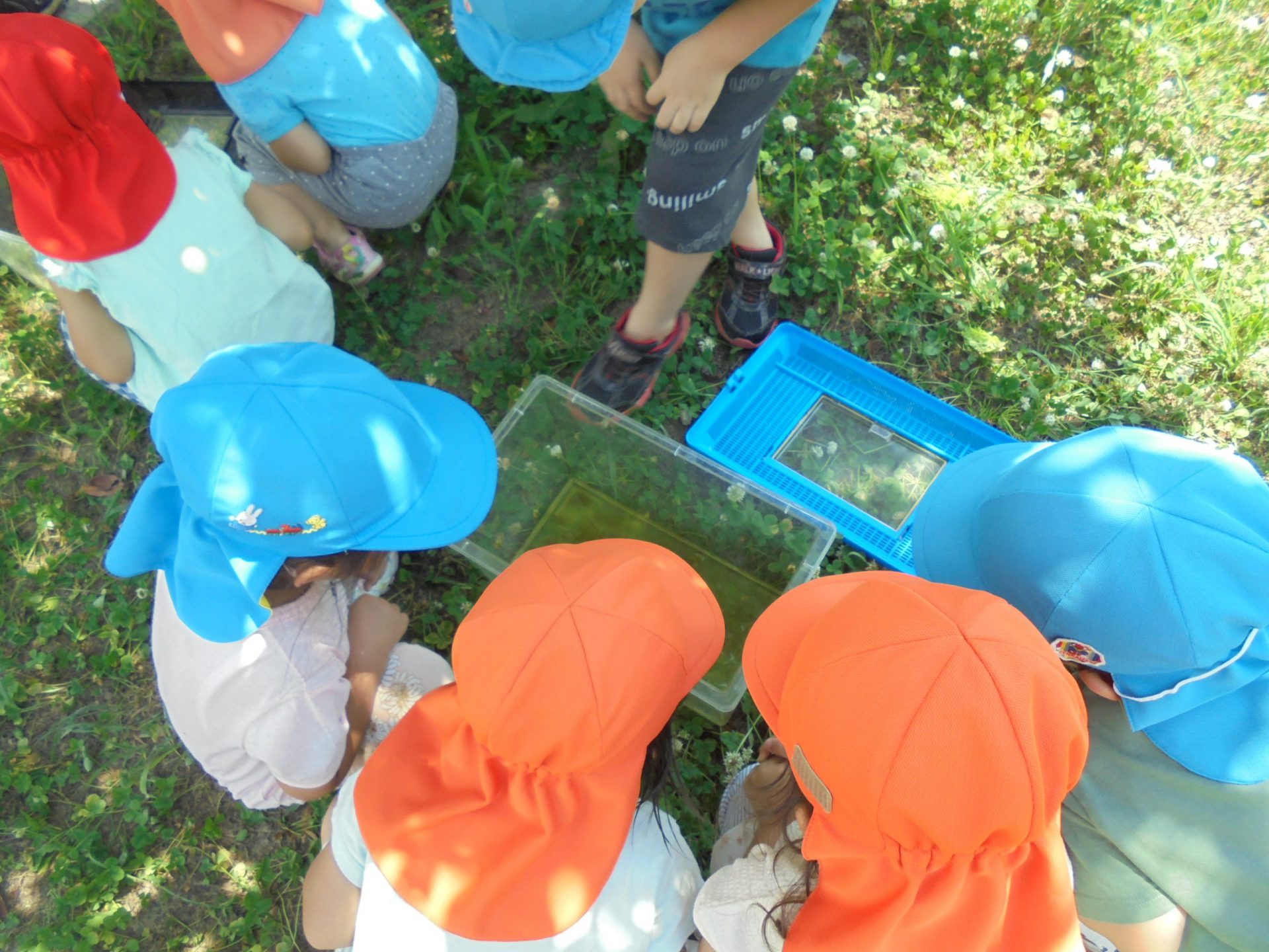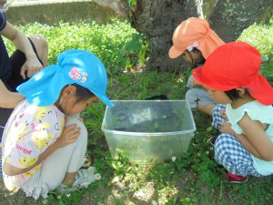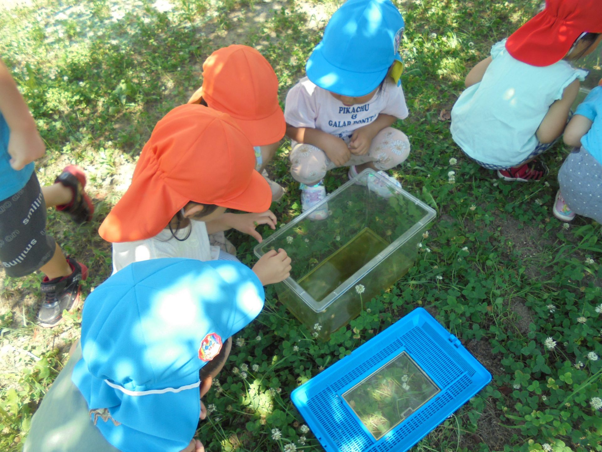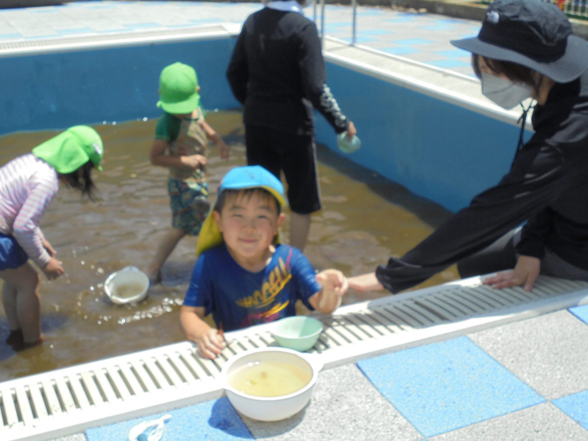 プール掃除の際、プールにいた沢山のオタマジャクシを見つけると「捕まえたい」「飼ってみたい!」と言い、恐る恐るプールの中に入った子どもたち。「ぬるぬるする」「気持ちわる~い」と言いながらもカップやバケツでオタマジャクシを捕まえ、クラスで飼い始めました😊